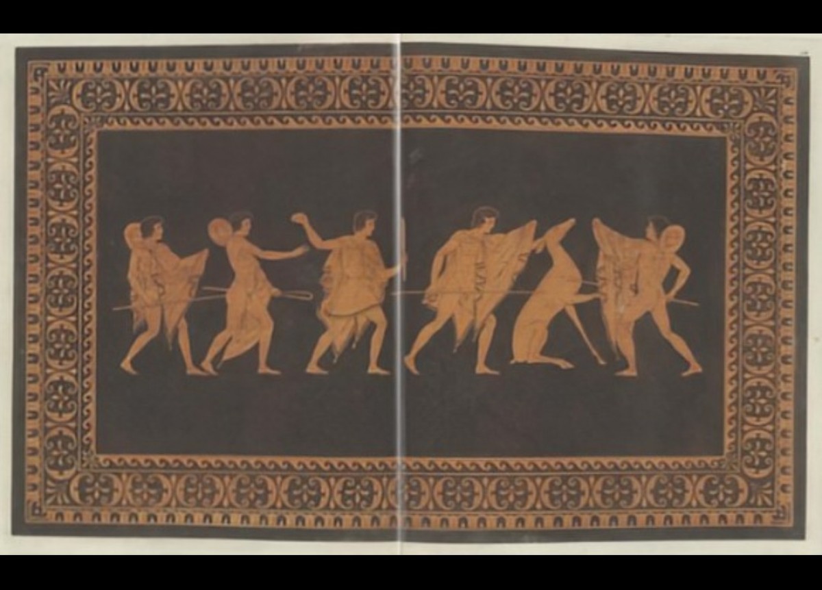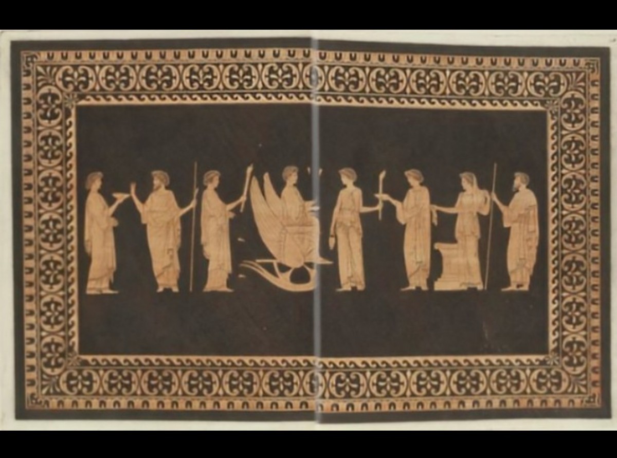 La première face reproduit le motif de ''chasse au cerf'', planche 110, page 430 ; tandis que la seconde reprend ''Triptolemus sur un char ailé'', héro des mystères Eleusiens, planche 128, page 472.