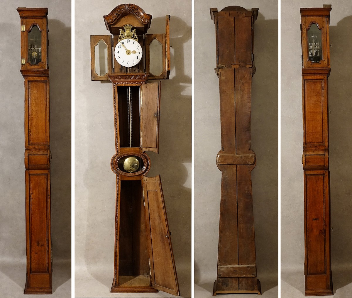 Note : L'horloge demoiselle de la Manche est le modèle d'horloge de parquet le plus renommé de Basse-Normandie, le plus élégant avec ses formes si particulières et évocatrices. Celle de Coutances compte, avec celles de Saint-Lô, de Bayeux et enfin de Vire, parmi les plus rares et les plus recherchées. Le mobilier coutançais, bien connu, n'est cependant pas le plus célèbre de Normandie, mais en revanche la demoiselle de Coutances jouit depuis des lustres d'une grande renommée. En voyant cette horloge, nous comprenons pourquoi. Aussi un tel modèle, avec une caisse et un mouvement parfaitement d'origine, le tout en parfait état, constitue aujourd'hui une rare opportunité.