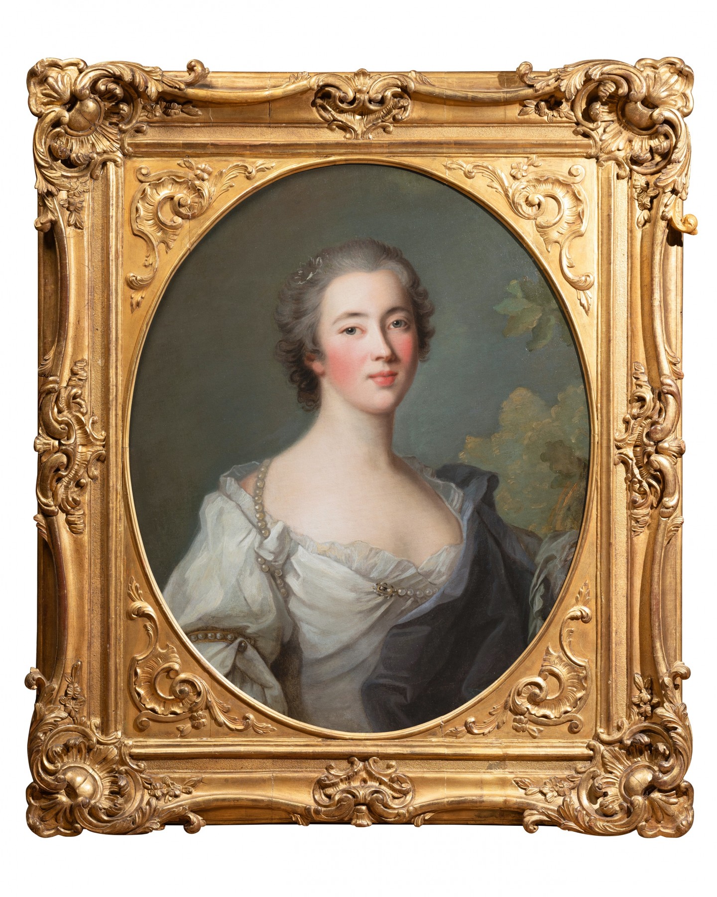 Notre œuvre est une variante d’atelier de format ovale, d’un portrait de format rectangulaire peint par Jean Marc Nattier en 1739. Adaptée à cette forme ovale, la composition présente quelques modifications : l’écharpe, qui dans l’original s’enroule autour de la figure, n’est ici retenue que sur l’épaule gauche, simplifiant ainsi le mouvement du drapé pour s’accorder au format ovale de notre portrait.