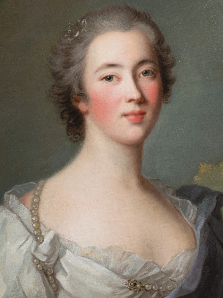 Le visage du modèle se distingue par une grande douceur de modelé. Les traits délicats, au contour souple et harmonieux, traduisent l’idéal de grâce féminine recherché dans le portrait mondain du milieu du XVIII? siècle. Les lèvres, pleines et légèrement entrouvertes, apportent une touche de sensualité discrète, tandis que les larges yeux ...