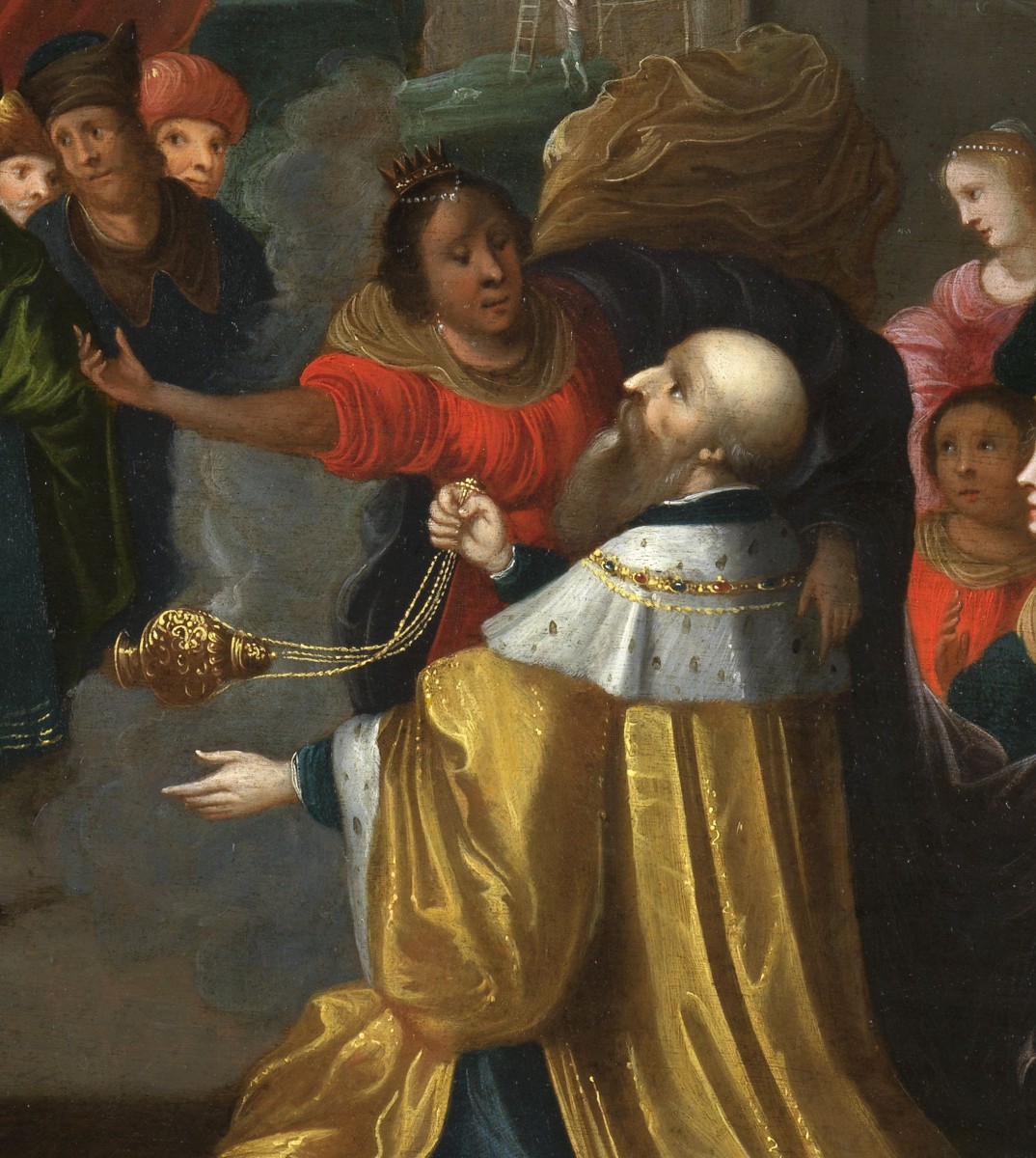 De nombreux artistes septentrionaux livrent leur interprétation de ce sujet qui sert d’illustration à la querelle des images entre catholiques et protestants. Frans Francken II a peint de nombreuses fois L’idolâtrie de Salomon selon une manière qui s’apparente fortement à notre peinture, en particulier dans une version datée des années 1610 dont la composition, les détails et les figures sont identiques. Notre tableau est vraisemblablement une version contemporaine réalisée par son fils, Hieronymus Francken III, qui travailla dans l’atelier familial anversois. Hieronymus déploie ici tout son talent pour représenter une foule de courtisans à l’allure cosmopolite dont les habits rappellent ceux des Ottomans qui assiégèrent Vienne au début du XVIe siècle. Ne sacrifiant nullement la qualité d’exécution à la quantité des protagonistes, il consacre un soin particulier aux figures dont la multiplicité confère de la vie à la composition. En dépit de ces nombreux détails, l’ensemble demeure lisible grâce à la division habile de la scène selon un axe oblique auquel le paysage en arrière-plan offre une respiration bienvenue.