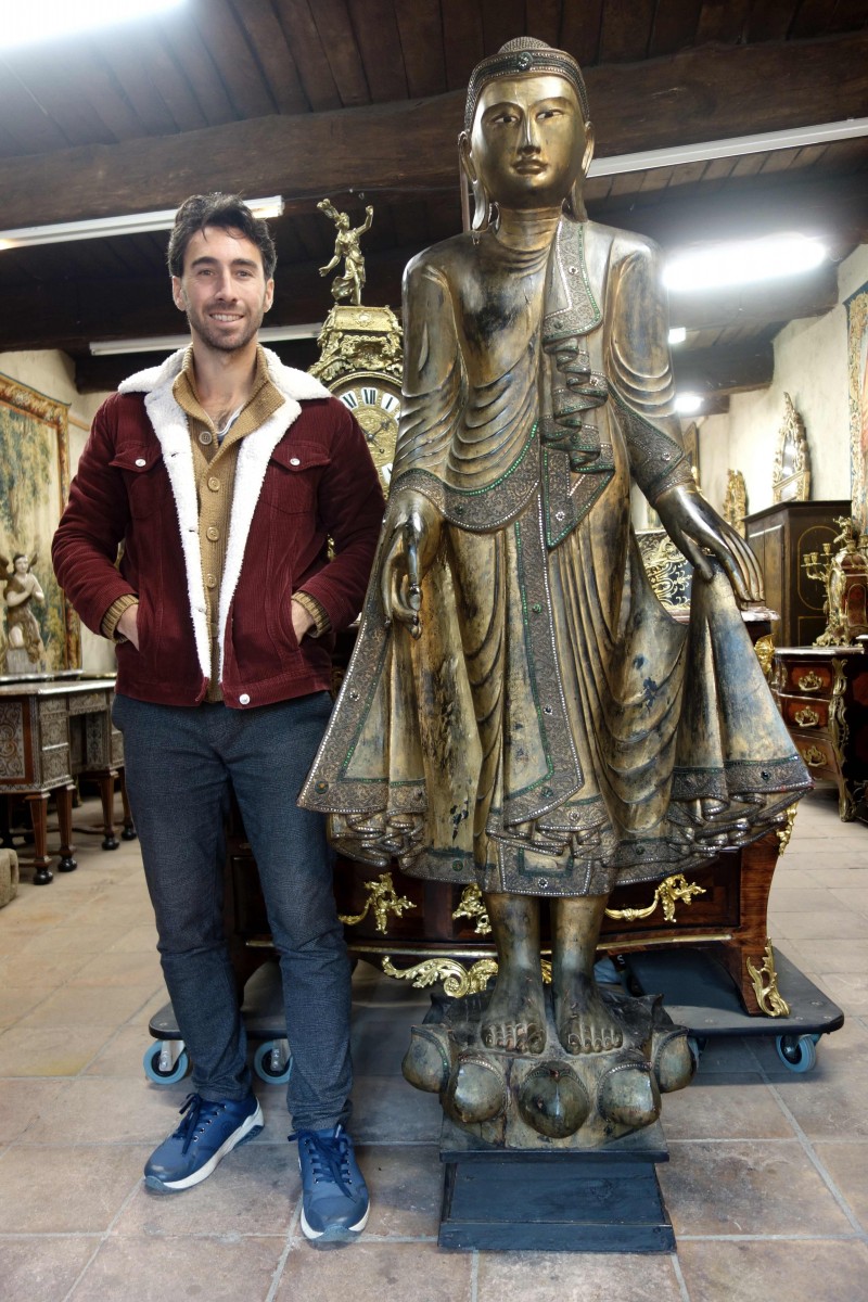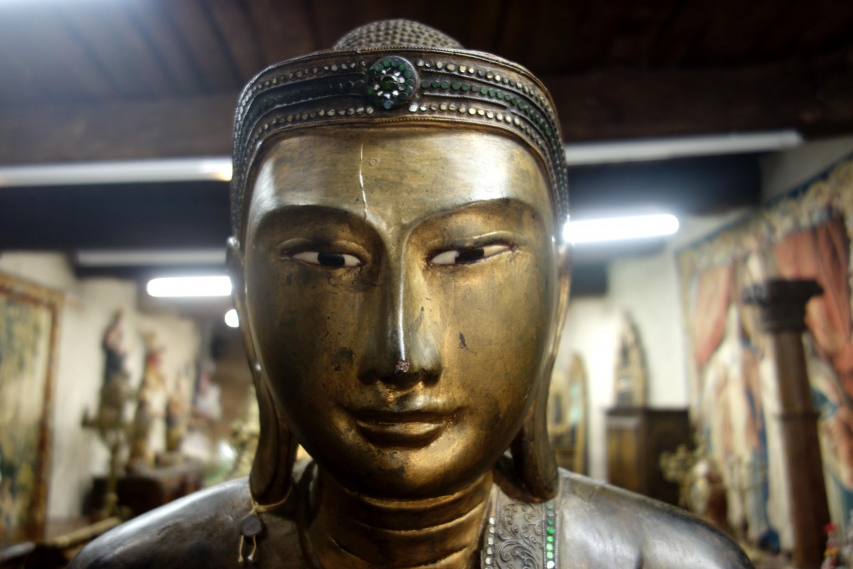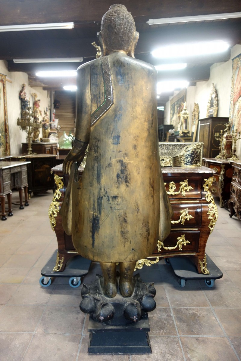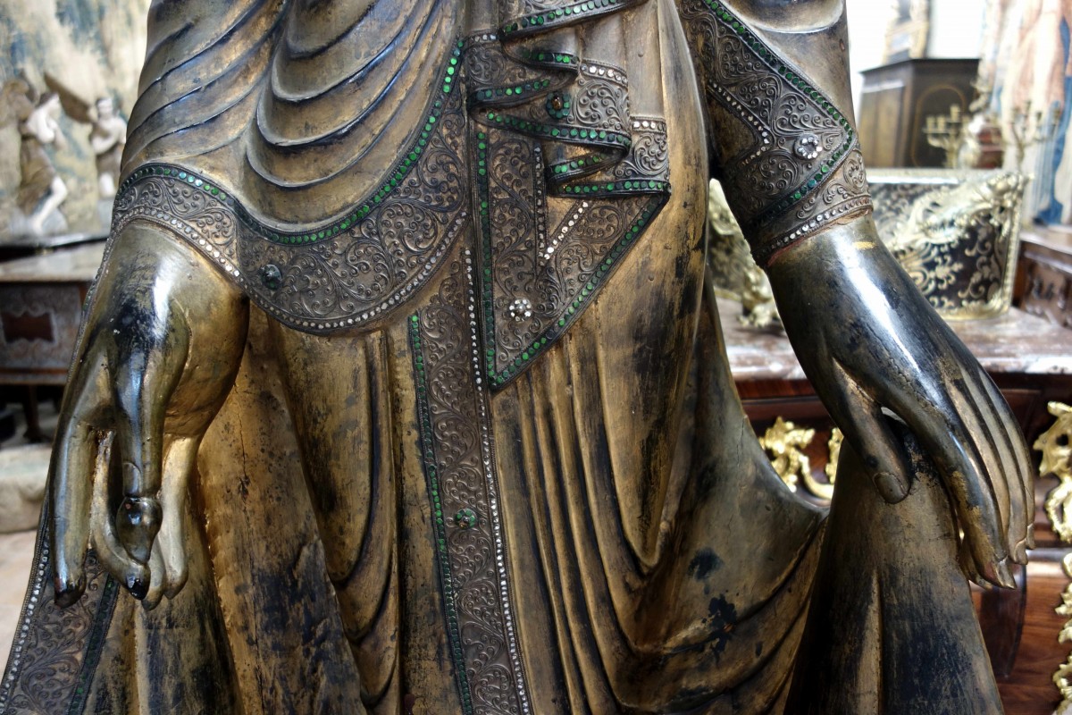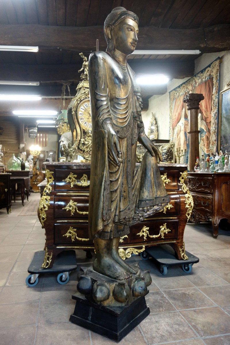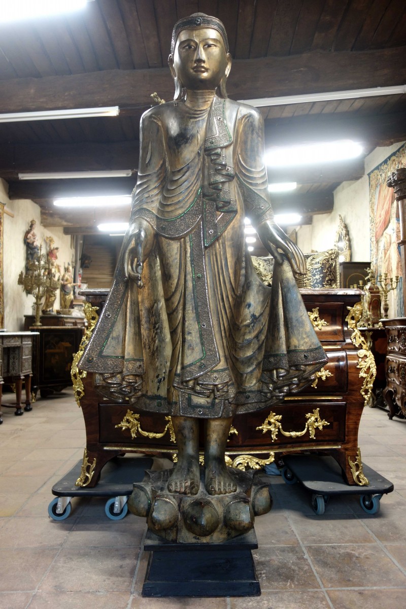 Grand Bouddha Birman en bois sculpté.