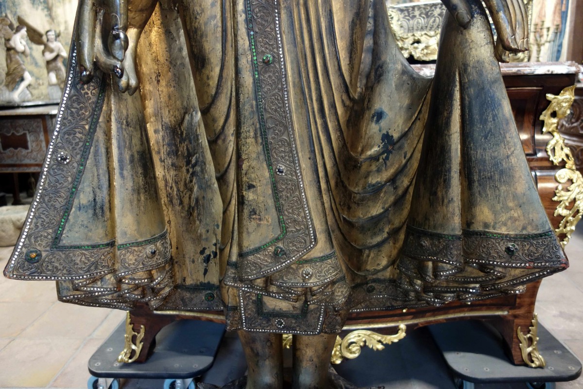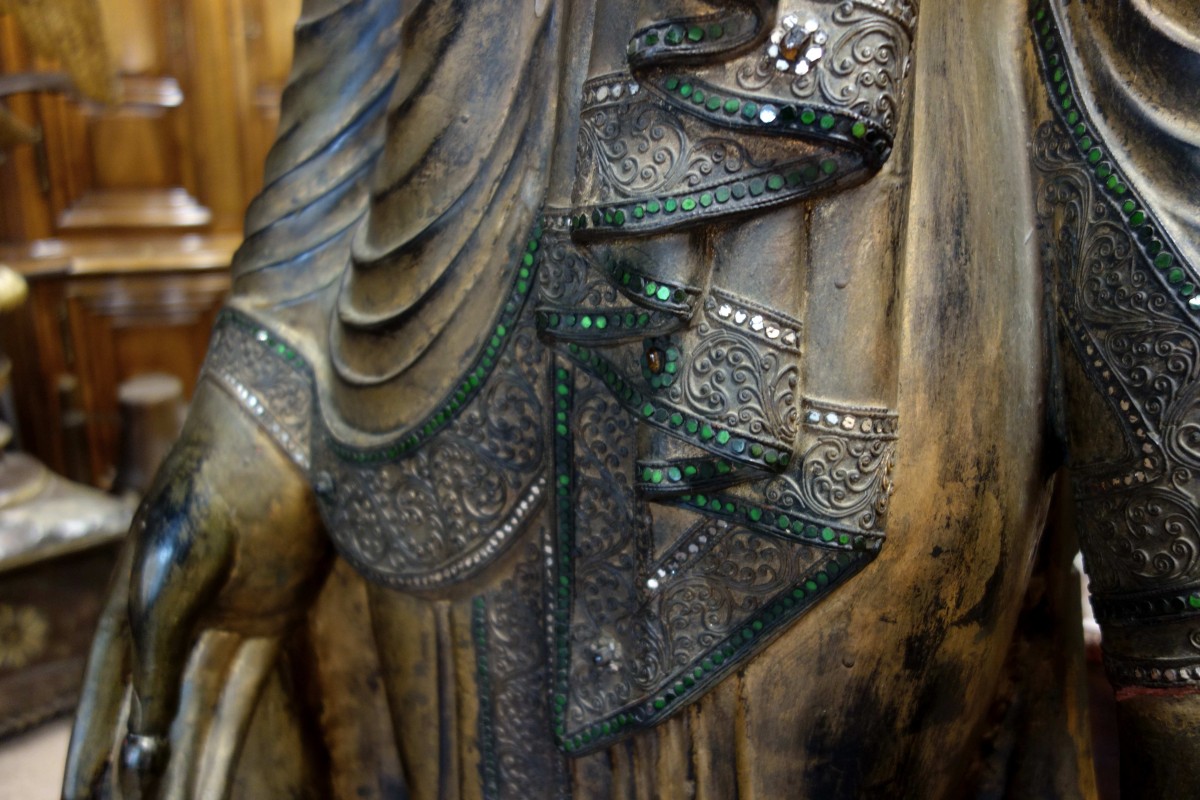 La tenue de l’Éveillé au visage calme et serein est agrémentée de nombreuses insertions de verre de différentes couleurs.