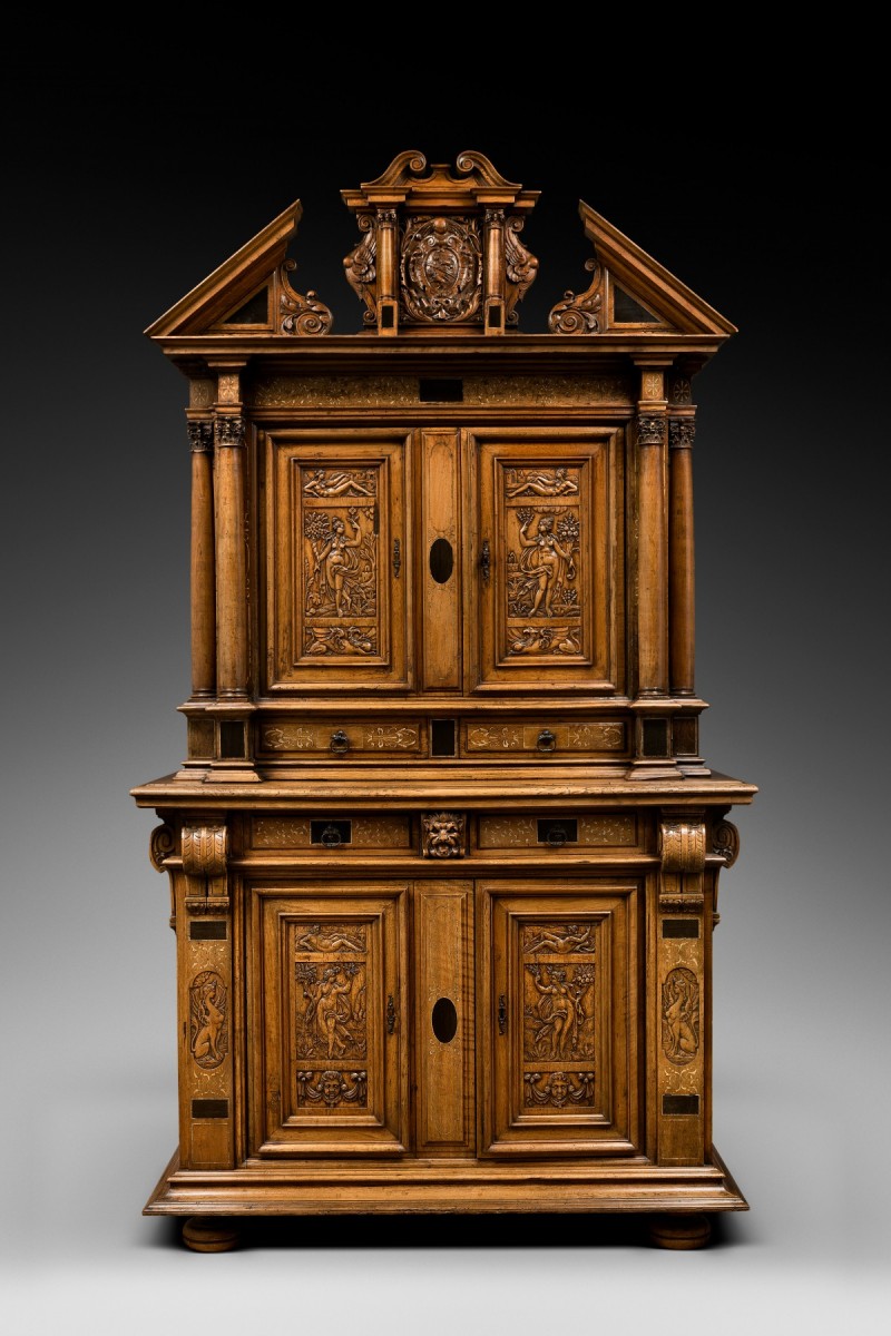 Tout dans ce meuble évoque la rigueur et l’élégance du règne d’Henri II, ce cabinet de la Renaissance est directement inspiré des réalisations bellifontaines de la seconde moitié du XVIe siècle. Sa puissante structure est conçue comme une imitation de l’architecture, avec ses belles colonnes corinthiennes et son élégant fronton, le tout relevant d’un grand raffinement.