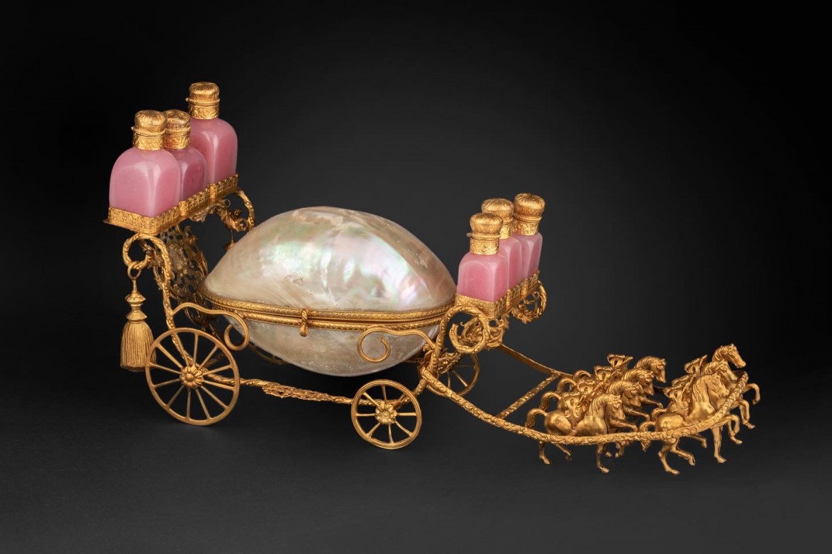 Il est formé d'un carrosse composé de deux grandes coquilles de nacre, formant coffret à bijoux, flanqués de deux marche-pieds.