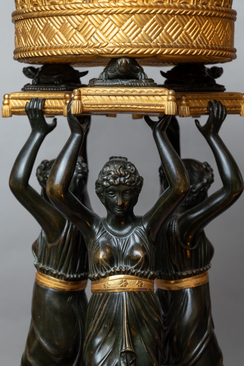 Important centre de table d’époque Empire, en bronze finement ciselé et doré au mercure, attribué à Pierre-Philippe Thomire (1751-1843). La composition présente trois cariatides drapées à l’antique, en bronze patiné, portant sur des coussins richement modelés des tortues finement ciselées, lesquelles soutiennent directement la corbeille ajourée à décor de palmettes et rinceaux, entièrement dorée. Ce dispositif iconographique élaboré, alliant symbolique et fonction, illustre un vocabulaire savant caractéristique des créations les plus ambitieuses de l’Empire. La base architecturée à pans coupés est ornée de trophées et d’attributs néoclassiques et repose sur des pattes et griffes de lions, motif de puissance et de majesté, renforçant le caractère monumental de l’ensemble. La qualité exceptionnelle de la ciselure, la richesse de la dorure au mercure et l’équilibre de la composition rattachent ce modèle aux meilleures ...