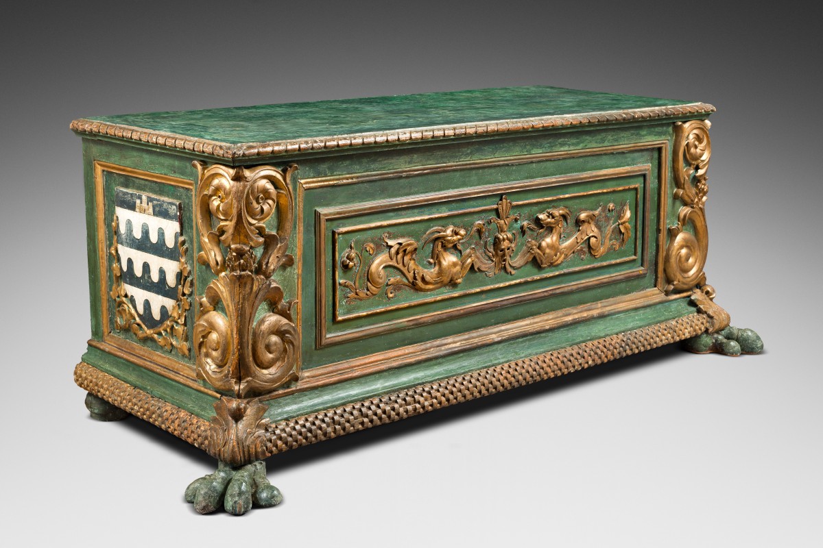 Retrouver le mobilier ou les objets d''art similaires à « Important coffre de la Renaissance italienne polychromé et armorié » présenté par Galerie Gabrielle Laroche, antiquaire à Paris dans la catégorie Cabinet & Coffre Renaissance, Mobilier.