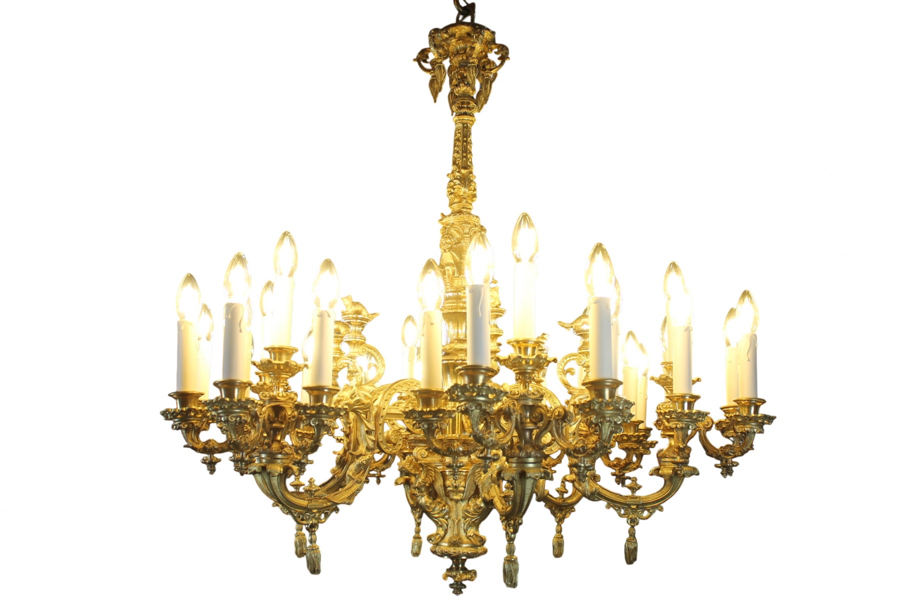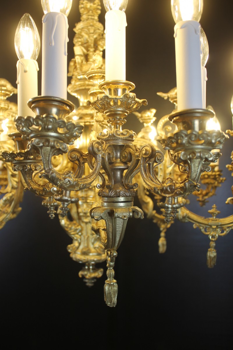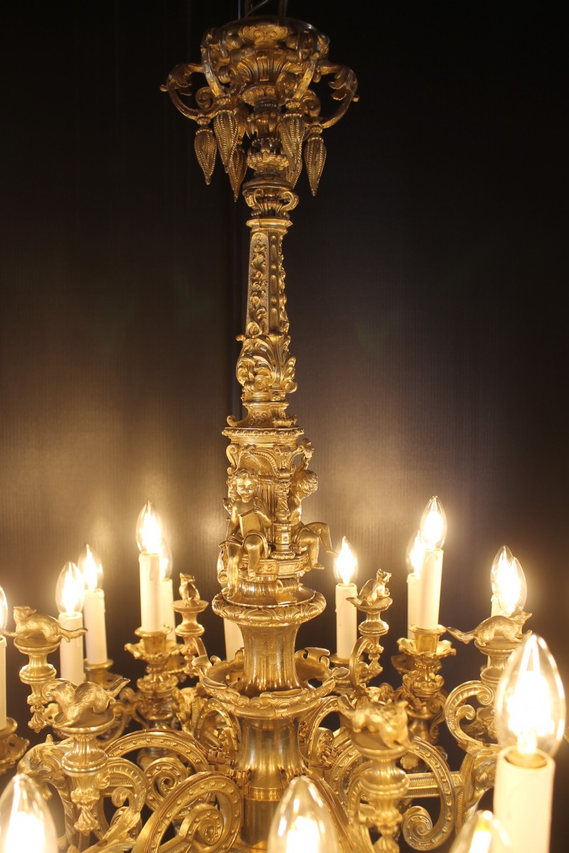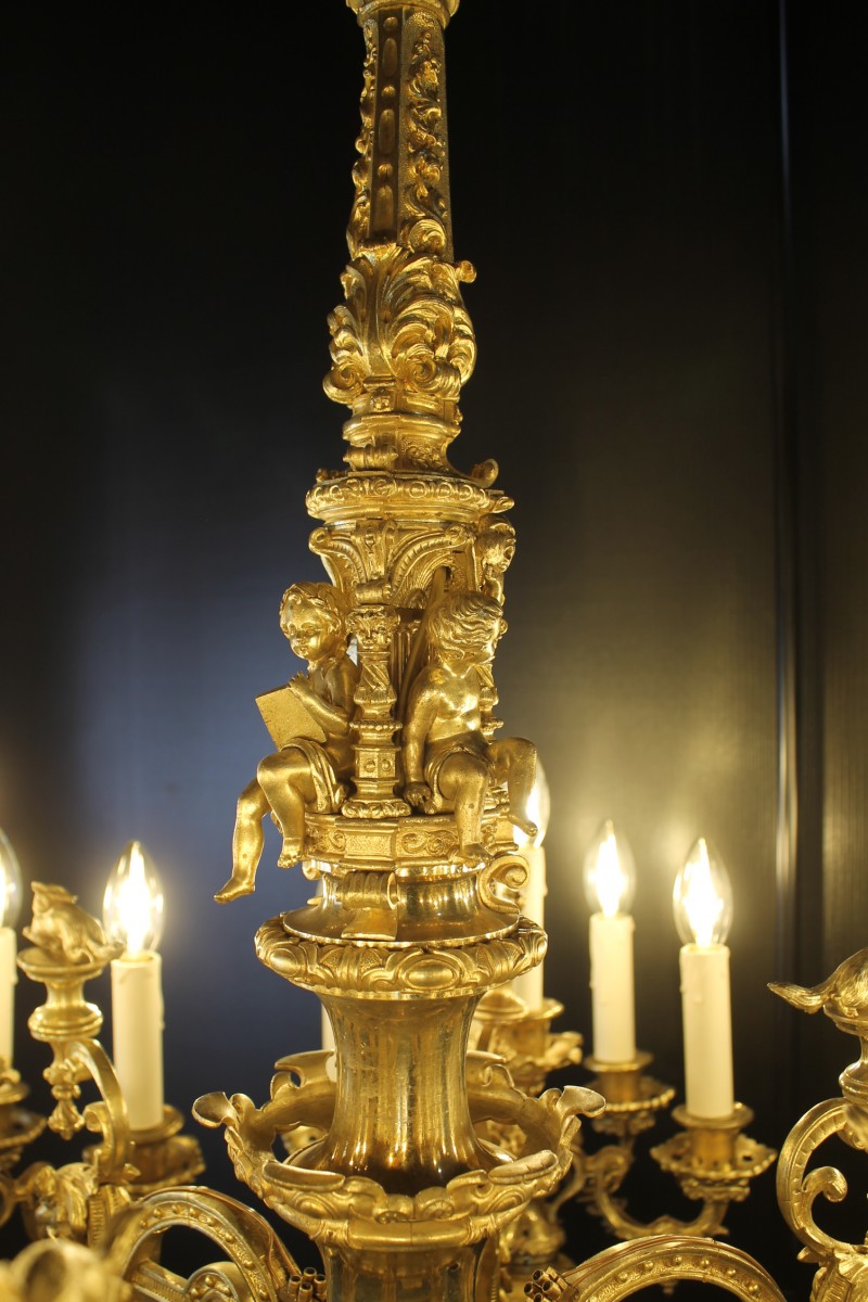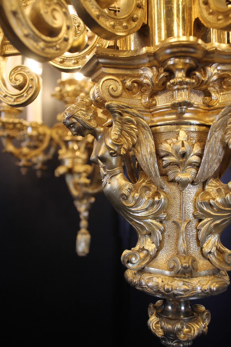 Retrouver le mobilier ou les objets d''art similaires à « Important lustre en bronze doré à 30 feux, époque Napoléon III » présenté par Antiquités Thierry Martin, antiquaire à St-Urbain dans la catégorie Lustre Napoléon III, Luminaires.