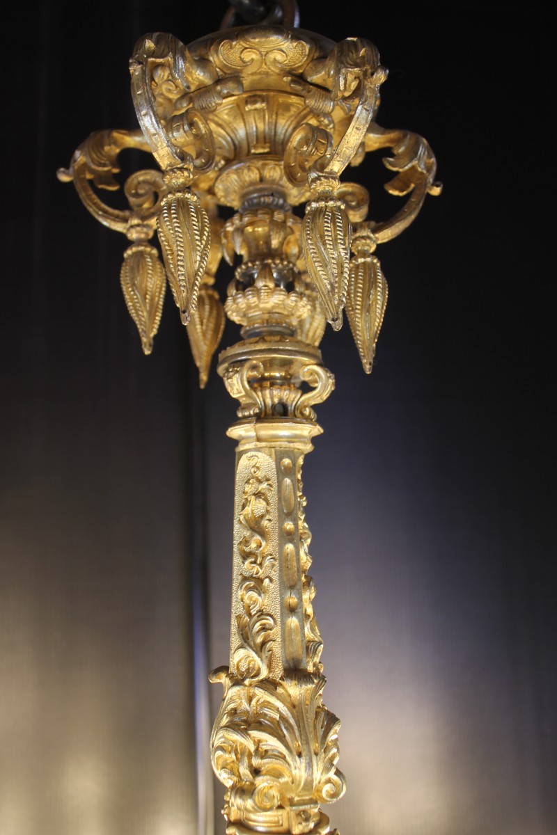 Exceptionnel et rare lustre en bronze finement ciselé et doré à six bras tenant chacun un bouquet de cinq feux.