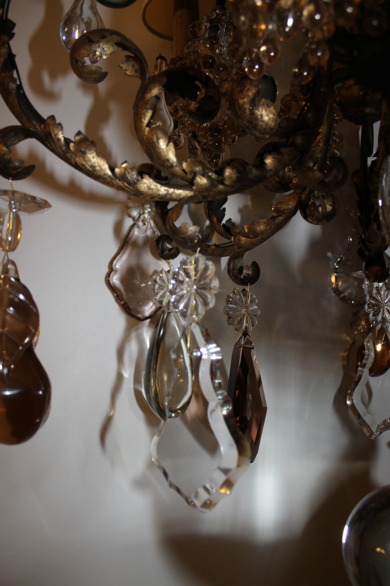 Important lustre à six bras de lumières et douze feux, la monture est en fer forgé à décor de feuilles d'acanthes à patine dorée, elle est ornée d'importantes plaques et fruits en cristal, les six feux centraux simulant des grappes de raisin.