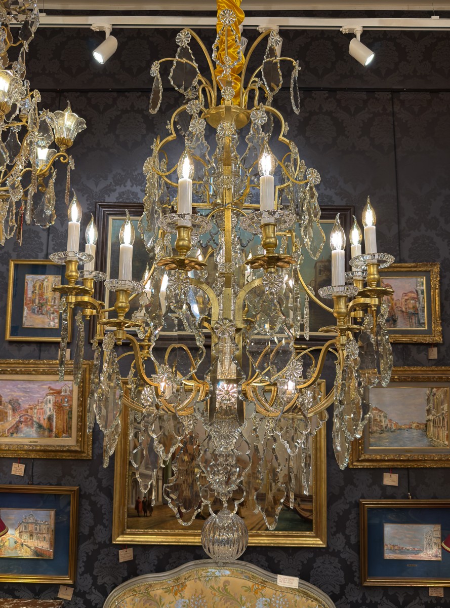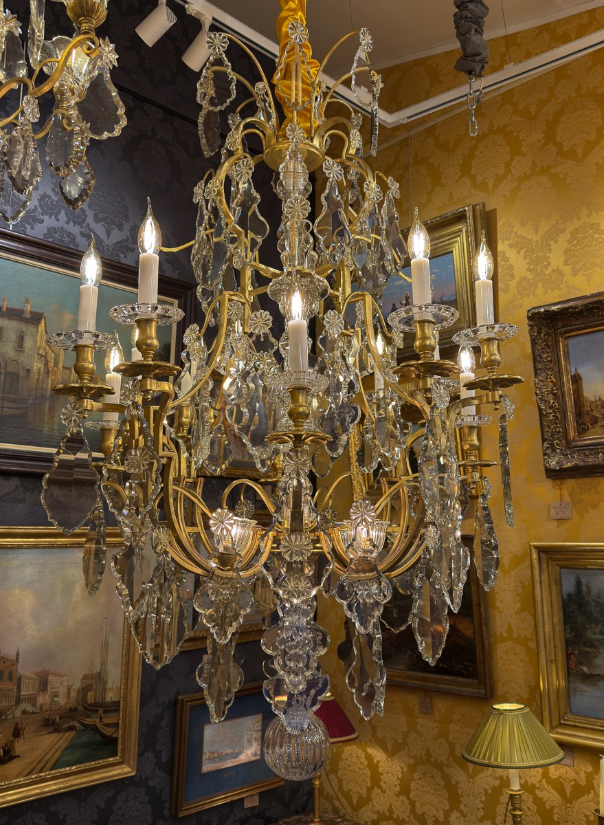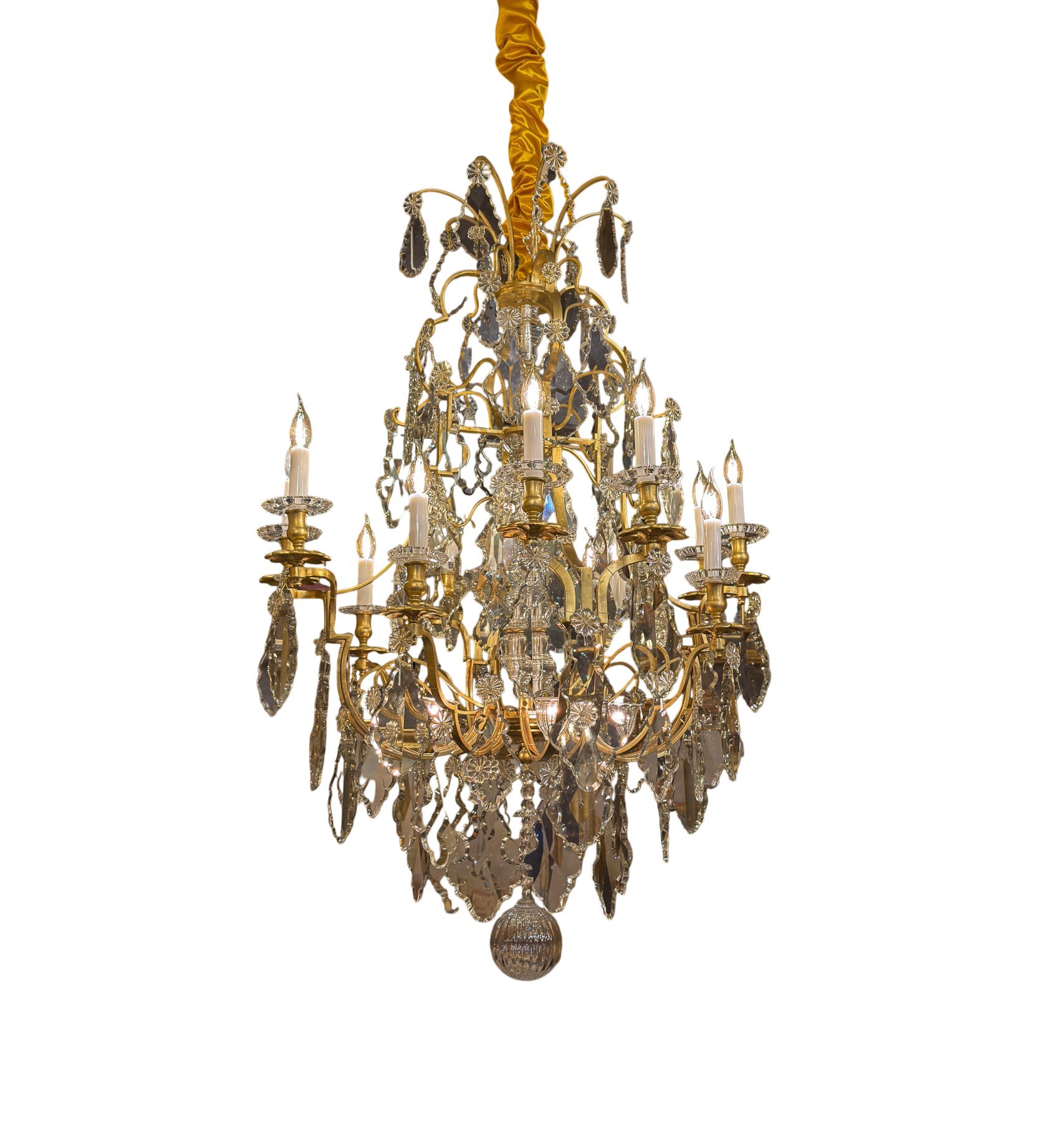 Un important par sa taille, élégant et décoratif lustre de forme cage de style Louis XV en bronze doré, éclairant par douze bras de lumière et quatre lumières intérieures. Le lustre est composé de très grandes plaquettes en cristal taillé de couleur blanche, au centre un enfilage de bouteilles en cristal taillé et se termine par une belle et grosse boule en cristal taillé.