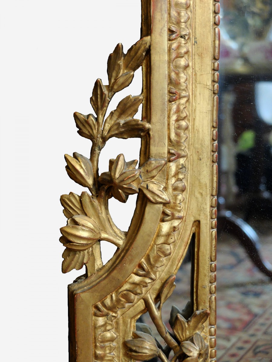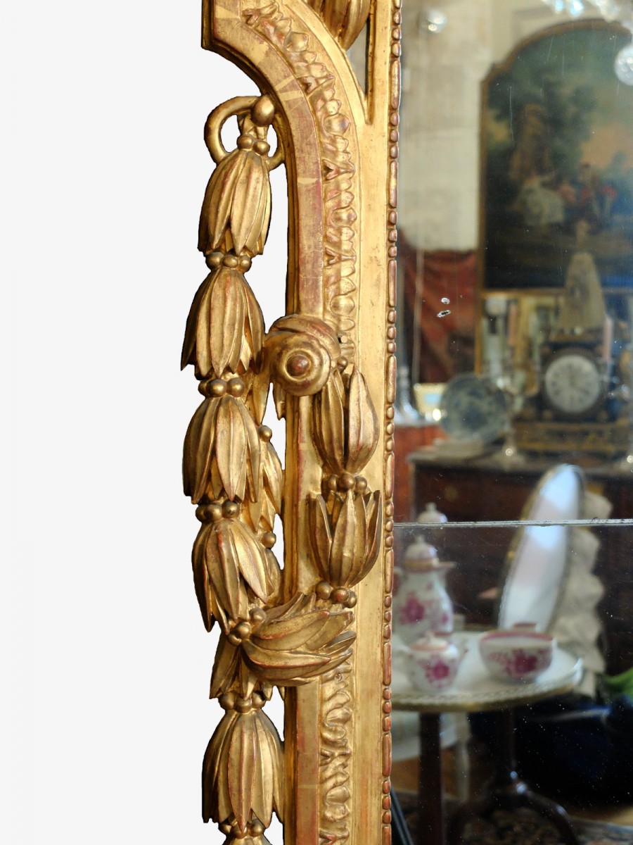 De forme rectangulaire et reprenant le répertoire des ornements néoclassiques, les montants sont ornés de guirlandes de lauriers ajourées et de branchages feuillagés. Ces branchages et guirlandes partent du haut et du bas du miroir par de petites parecloses.
