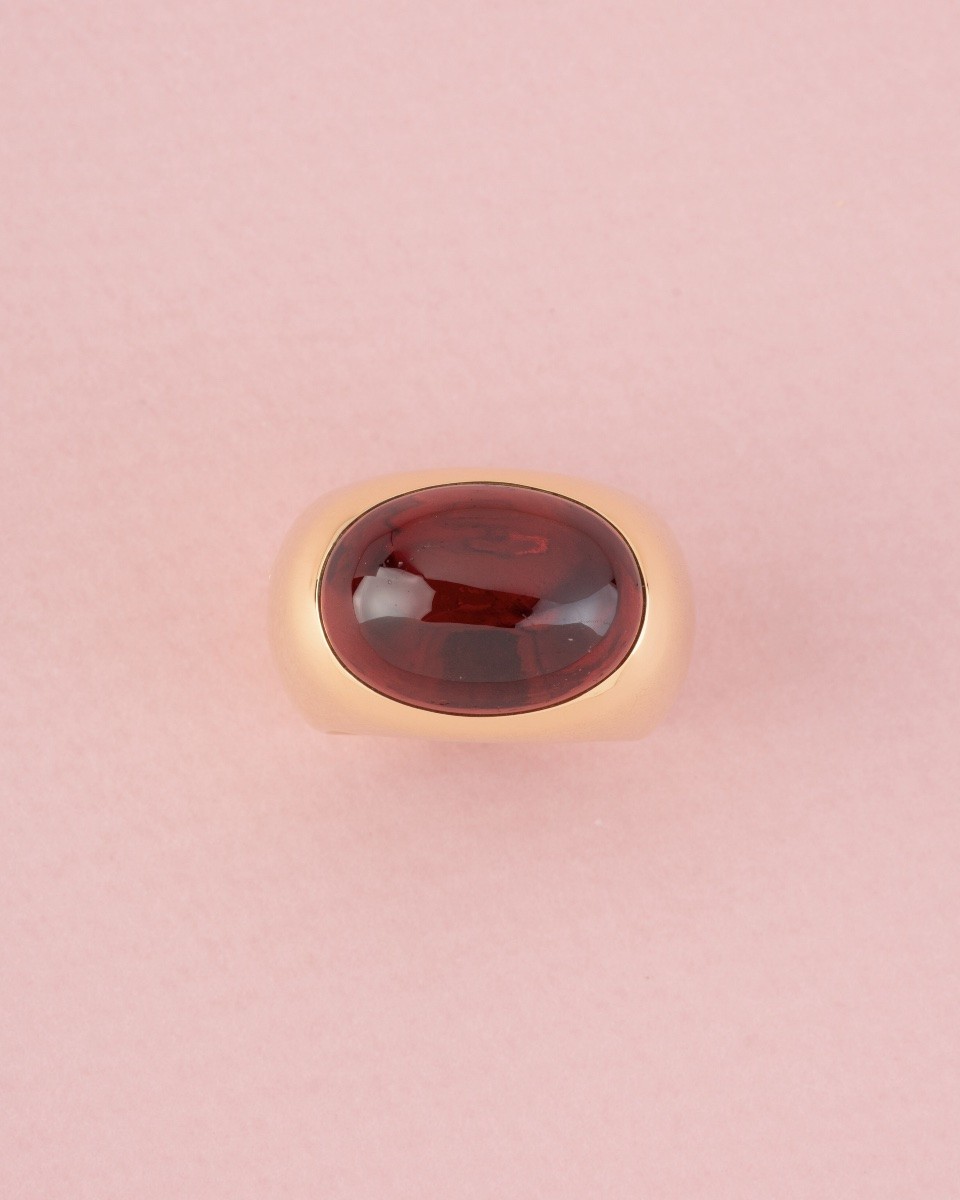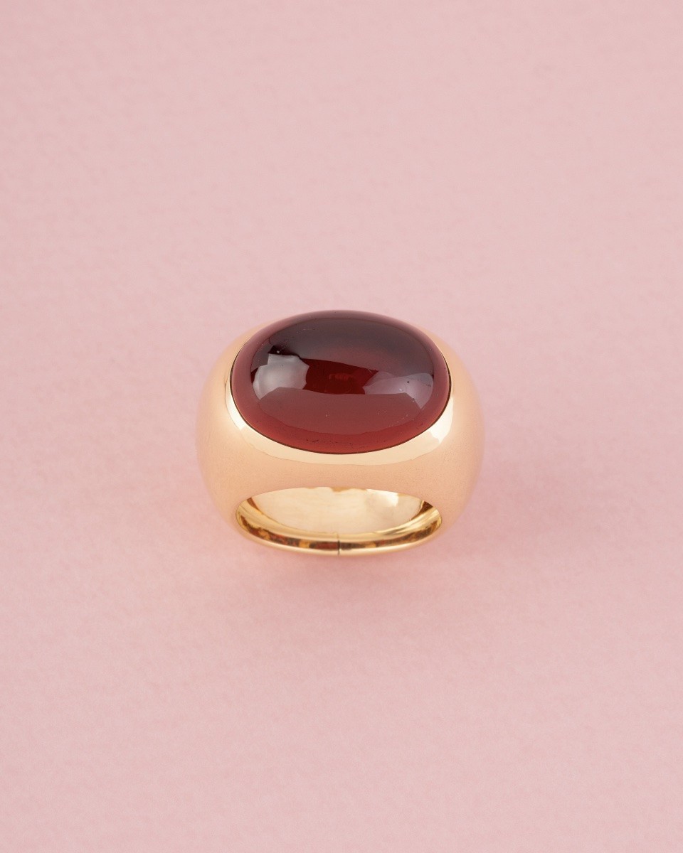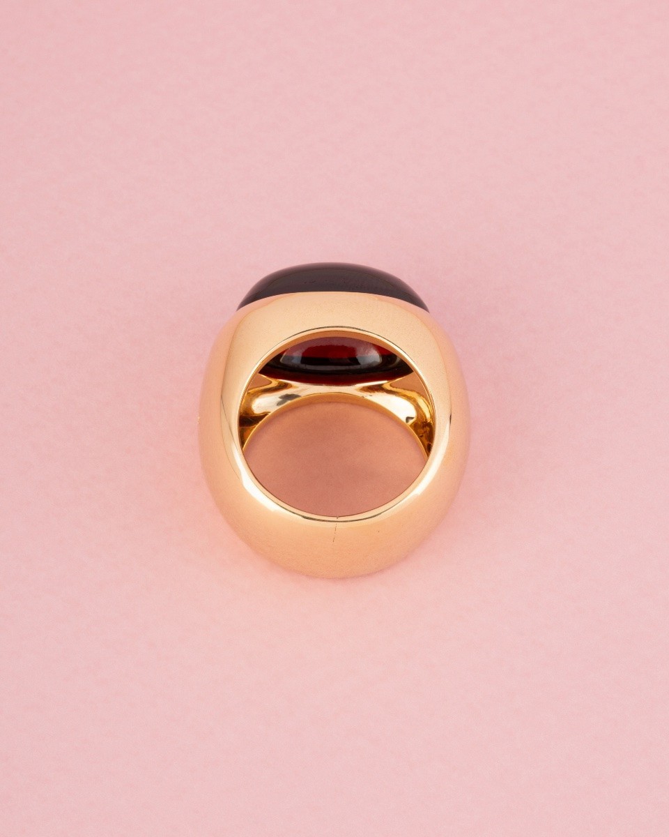 Importante bague Pomellato des années 90 en or jaune 18K sertie d’un grenat taille cabochon.