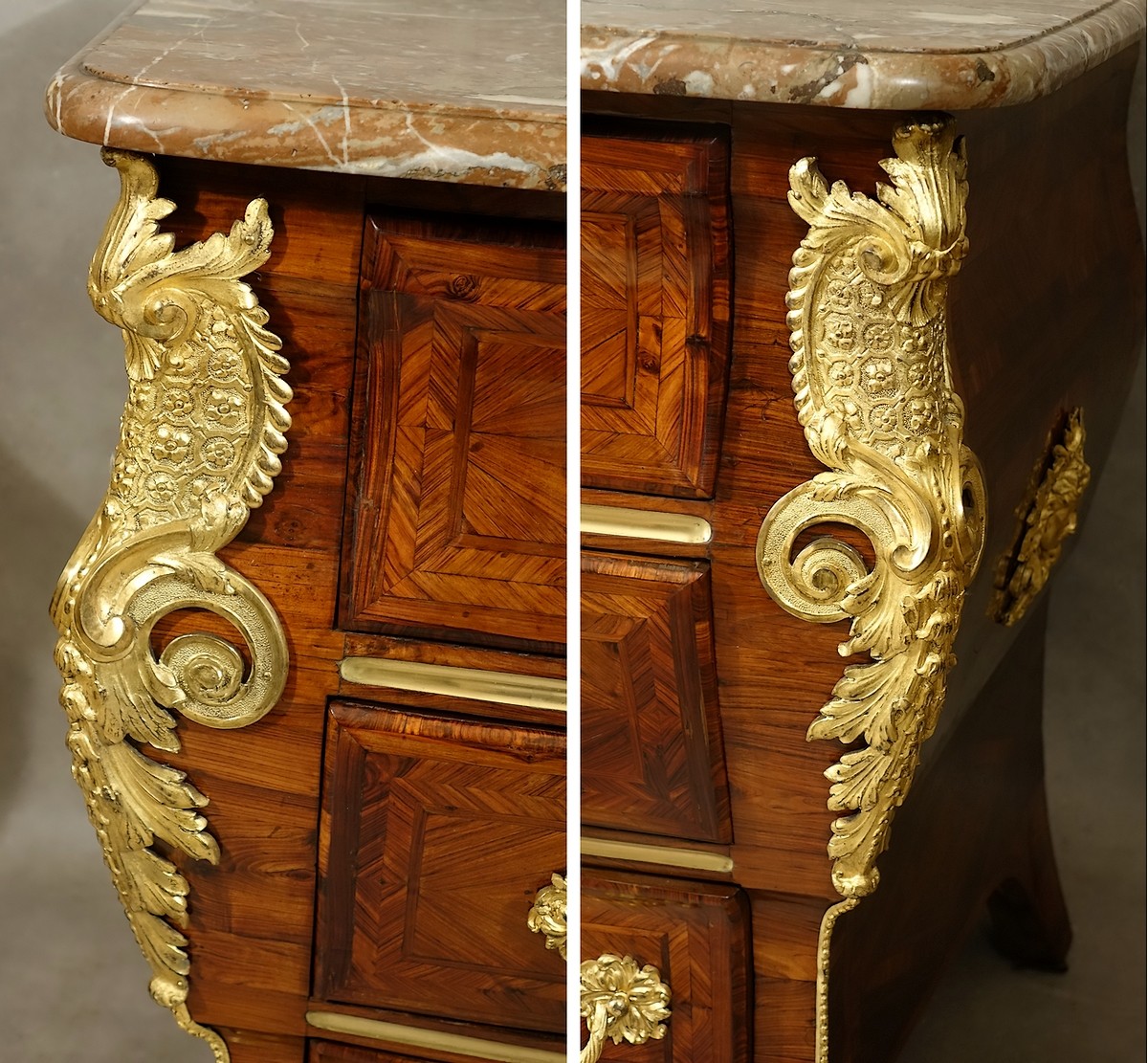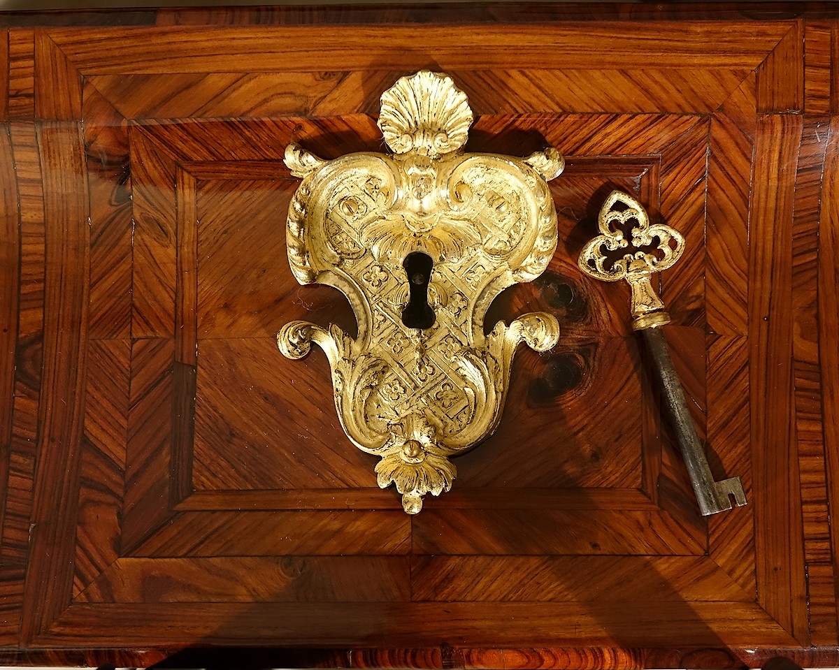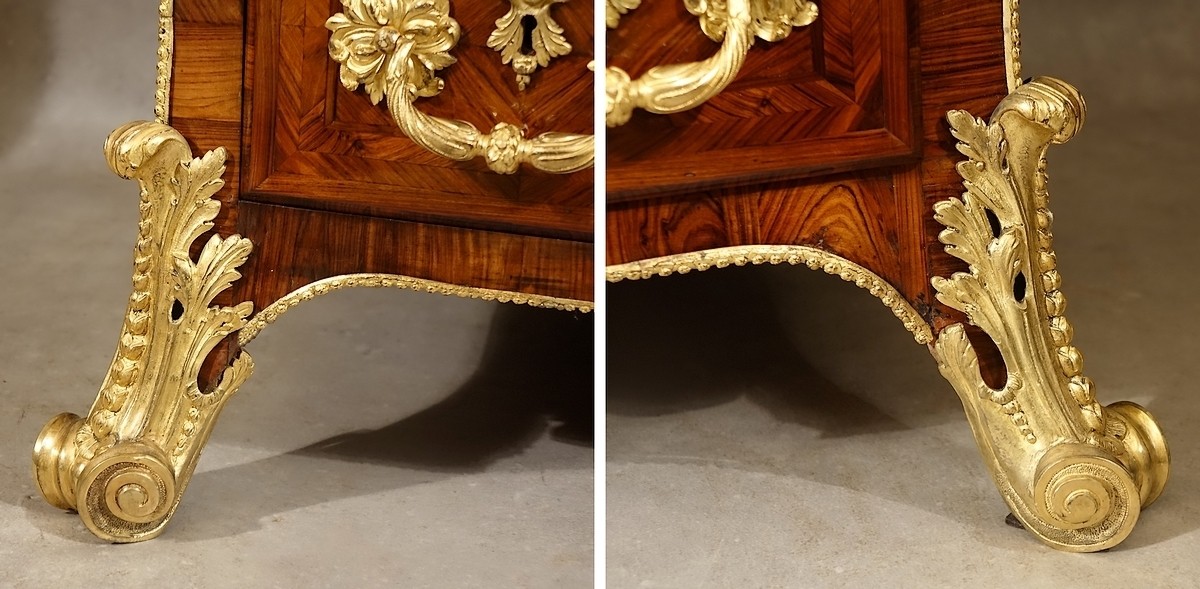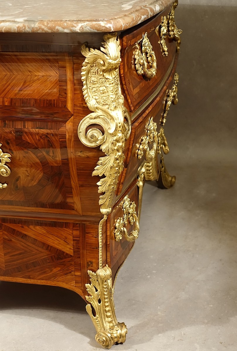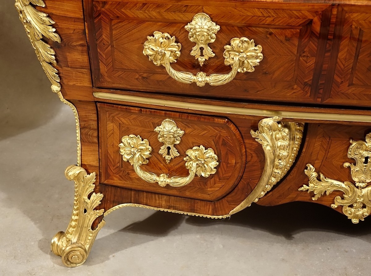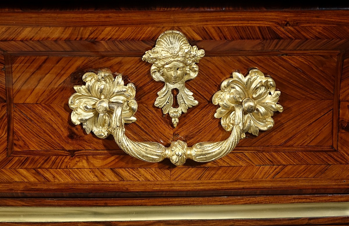 Le modèle que nous présentons, désigné sous le nom de commode "en sarcophage" pour ses analogies avec celui du Grand Trianon, possède de même des formes galbées mais encore exclusivement orientées vers l'élévation. Initiant l'affranchissement de la ligne droite il est donc à voir comme une étape intermédiaire entre la commode Louis XIV et la commode Régence. On rencontre quelquefois ce type de commode avec conservation du plateau de bois marqueté très louis-quatorzien mais aussi présentant assez souvent les caractéristiques de la commode dite "à pont" (exemple de la commode attribuée à Noël Gérard de la succession Maria Callas), mais quoiqu'il en soit avec une même constante, une fabrication de haute qualité.