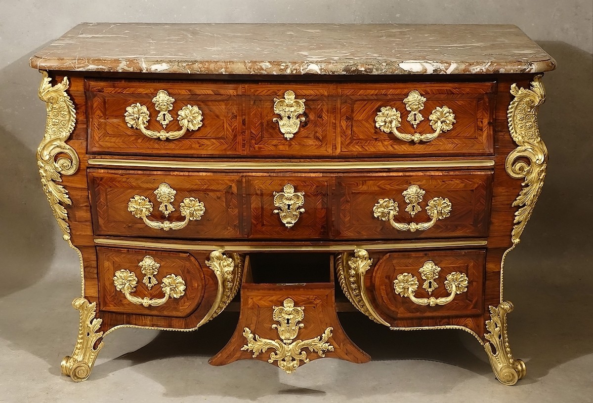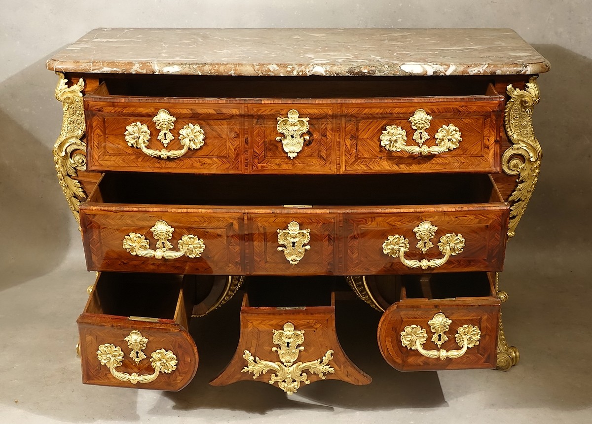 Ce n'est donc que quelques années plus tard, à l'époque du Régent, que vont apparaître, à la suite des productions boulliennes, des commodes galbées tout d'abord en élévation, puis galbées en plan et en élévation, commodes que l'on nommera durant tout le XVIIIe siècle "à la Régence" (et de même d'ailleurs il faudra attendre les années 1720 pour revoir des commodes à deux rangs de tiroirs, nommées "à la Cressent").