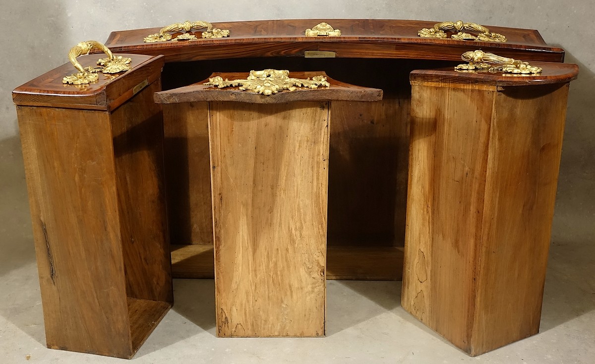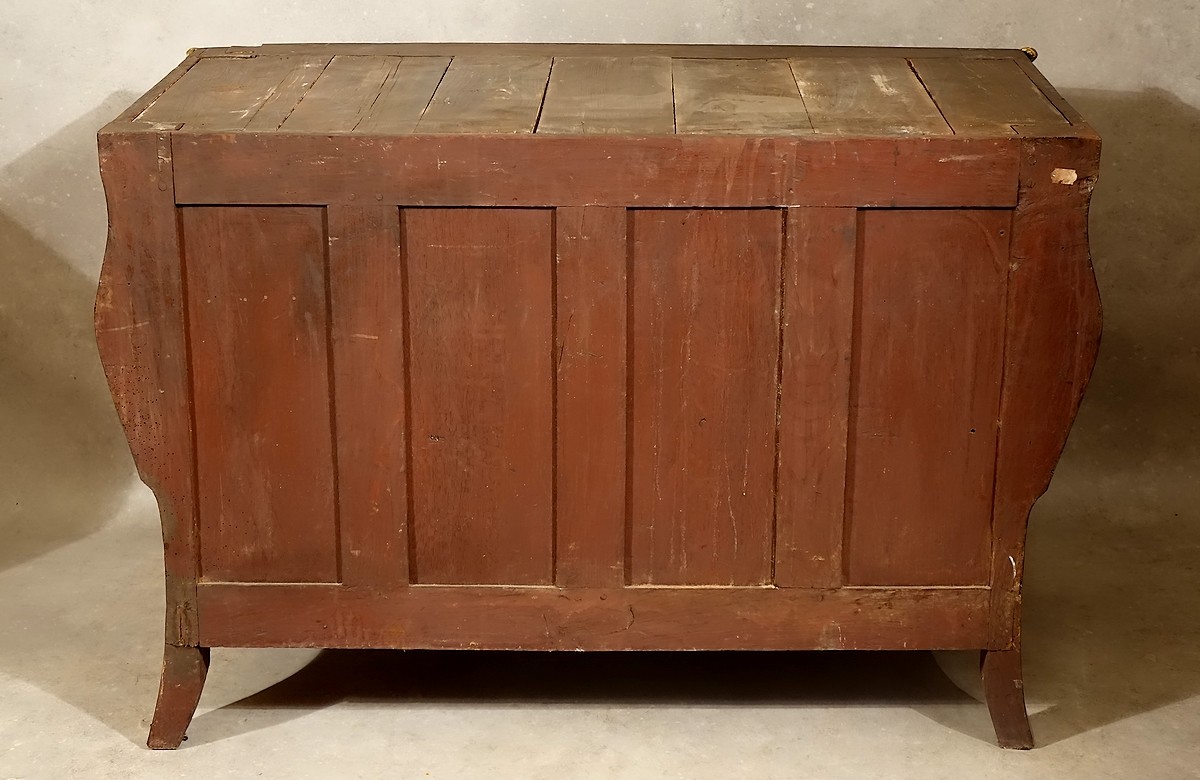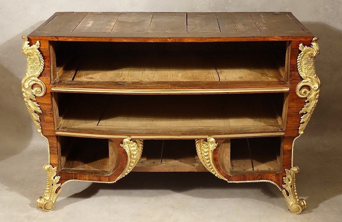 Le bâti est conforme à celui des plus belles réalisations de la Régence, les essences utilisées sont un conifère de qualité pour les façades des tiroirs, les planchers intermédiaires ainsi que les côtés, un chêne également de la plus belle des qualités pour les quatre épais montants et le dos, et enfin un superbe noyer parfaitement corroyé pour la totalité de la réalisation des caissons de tiroirs finement montés à encastrement.
