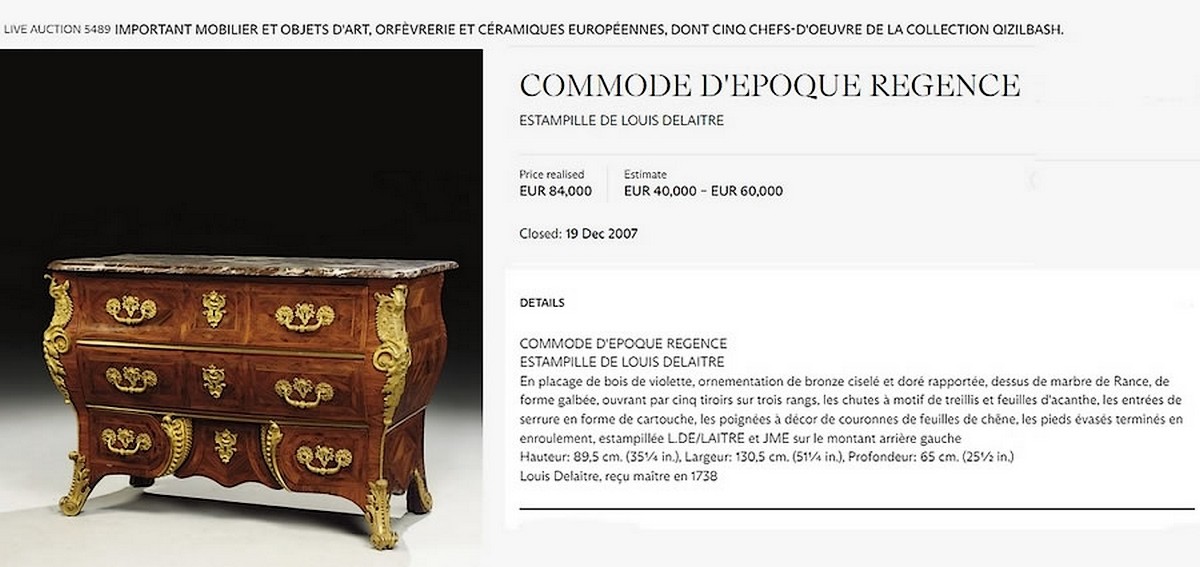 "Delaitre a produit surtout des commodes...faisait, dans ses placages, un large usage du bois de violette et savait adapter des bronzes d'un dessin harmonieux et distingué."