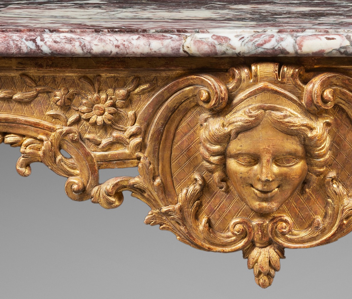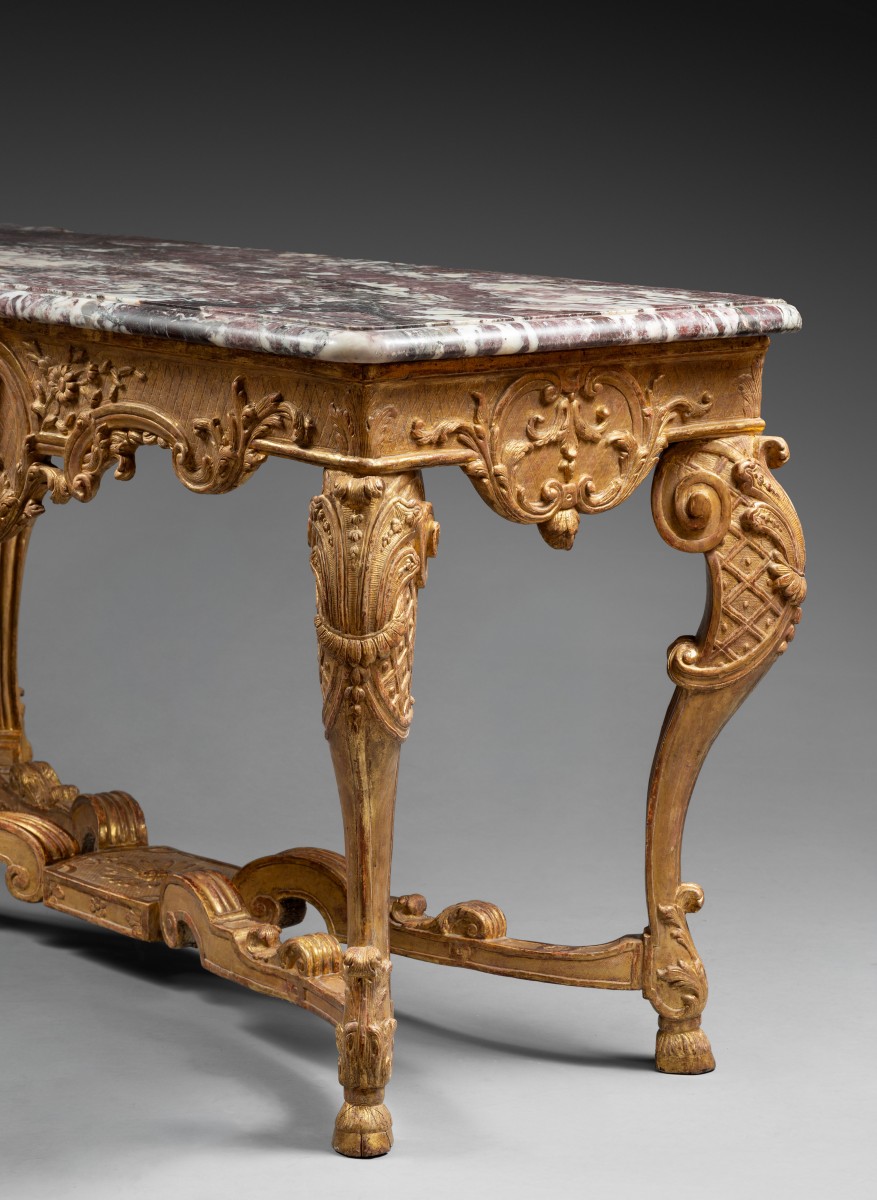 Notre console, en tilleul sculpté, fut exécutée quelques années après la fin du règne de Louis XIV; elle conserve une belle entretoise en X, composée de volutes feuillagées et d’un plateau fleuri en son centre. Comme l’entretoise, les ceintures sont sculptés sur des plans encore très droits, mais rythmés par des découpes prononcées. Quelques ajours apparaissent déjà. Les montants qui forment les pieds sont puissamment balancés. La beauté de cette console s’appuie sur un équilibre des galbes et des volumes absolument parfait.
