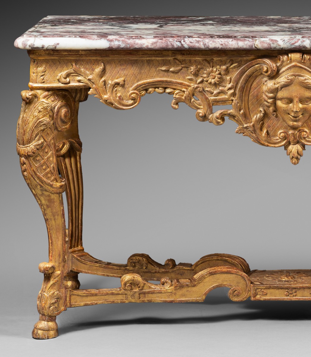 Retrouver le mobilier ou les objets d''art similaires à « Importante Console d’époque Régence en bois sculpté et doré » présenté par Galerie Delvaille, antiquaire à Paris dans la catégorie Console Régence, Mobilier.