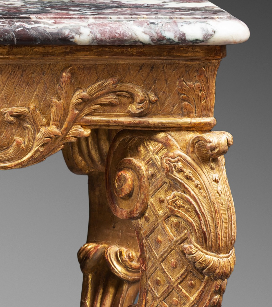 ... symétriques sont proportionnés aux volumes et laissent des parties épurées qui mettent d’autant plus en valeur la qualité des parties travaillées. Sur une grande partie de la console, les fonds sont travaillés en reparure de quadrillages, tous différents selon les parties du meuble. L’éclat de la dorure est donné par l’alternance subtile des parties mates et des brunis, que ce soit en ceinture, sur les montants ou sur l’entretoise.