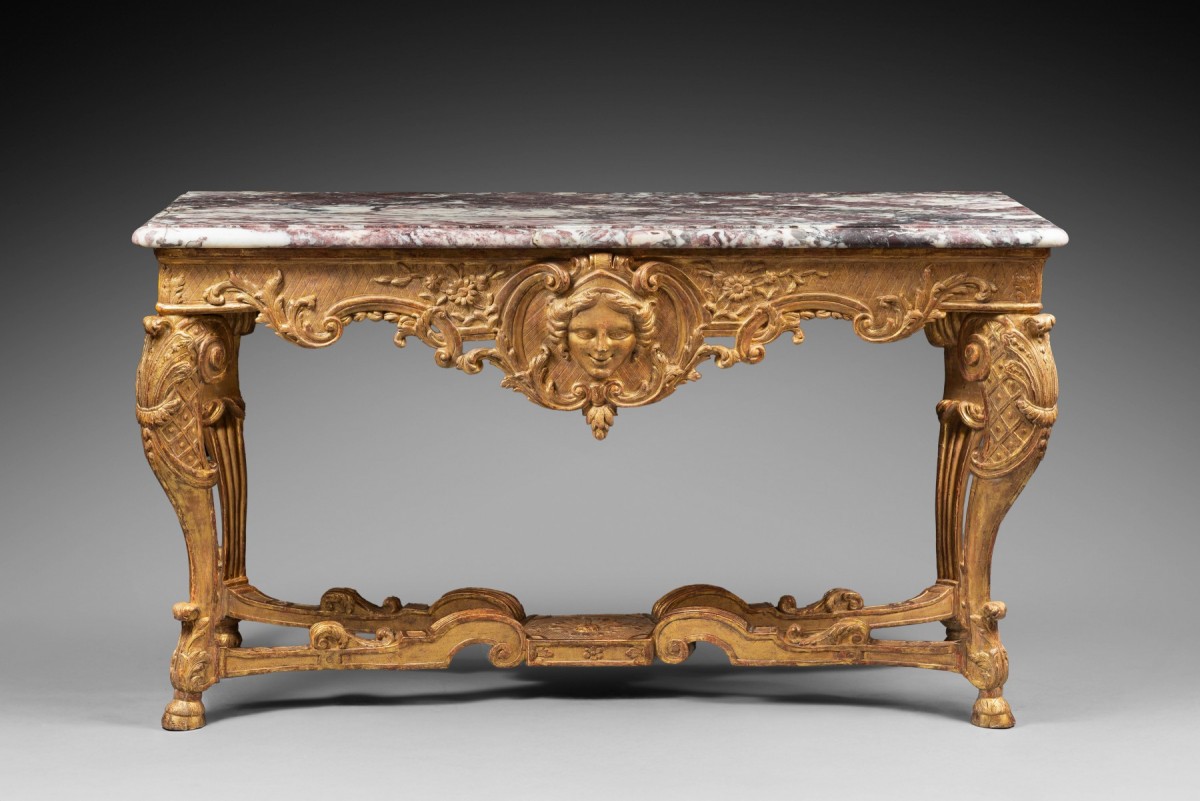 Ce type de console du premier quart du 18ème siècle, en bois doré et surmonté d’un marbre, est communément appelé « Table à gibier ». Elles apparaissent dès l’Epoque Louis XIV, en chêne naturel ou en bois doré.