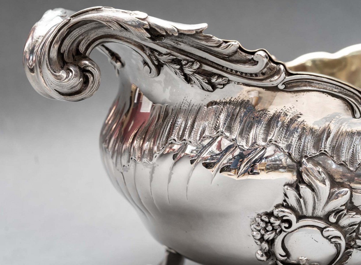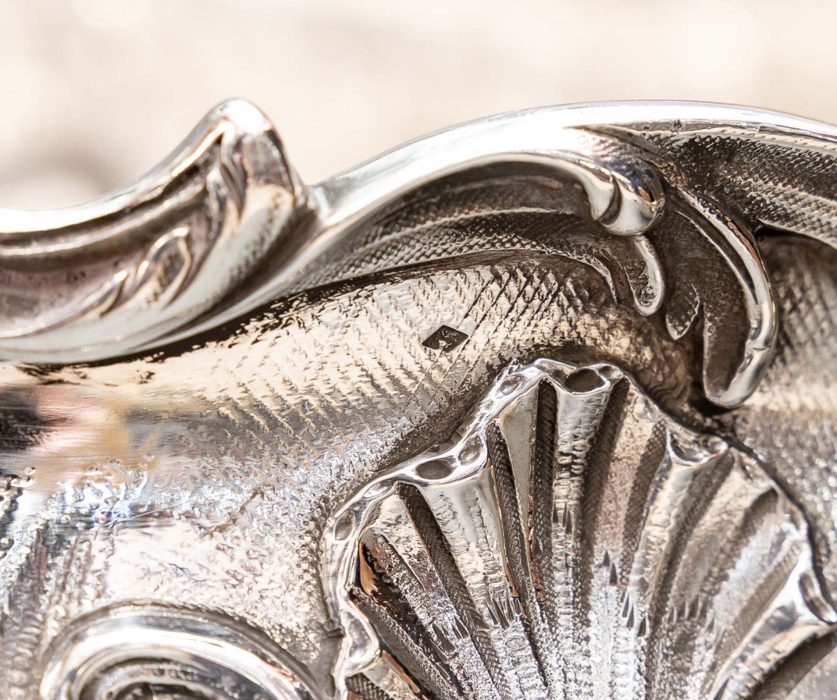 Jardinière en argent de forme oblongue, reposant sur quatre pieds griffes en crosse feuillagée. Le corps est orné au repoussé d’une frise de rainures. Sur les grands côtés se trouve un cartouche rocaille surmonté d’une coquille. Les anses solidaires sont à motif d’enroulement. La doublure intérieure amovible est en cuivre repoli.