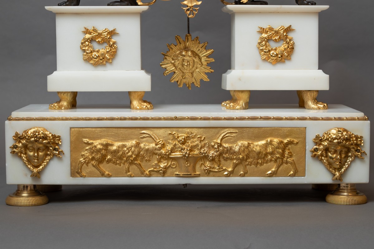 Élégante et spectaculaire pendule d’époque Empire en bronze finement ciselé et doré au mercure, reposant sur une architecture en marbre blanc.