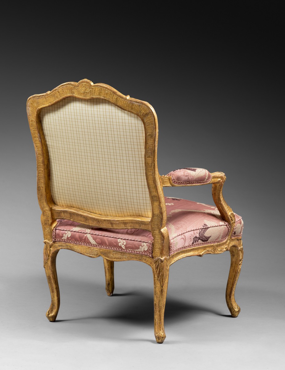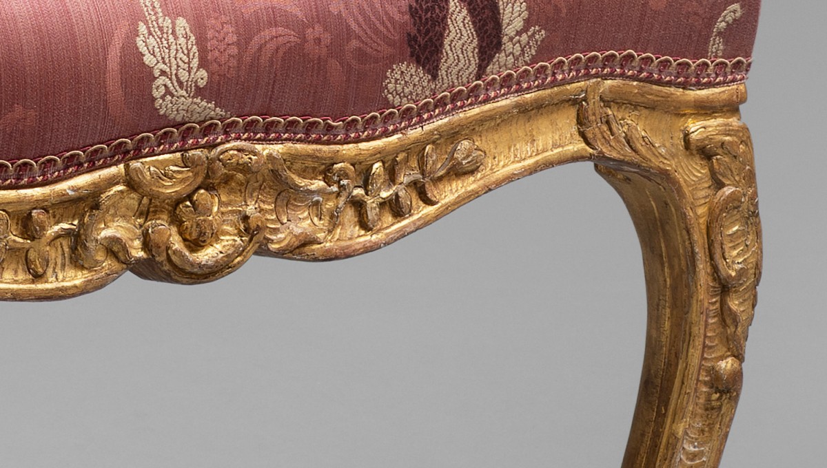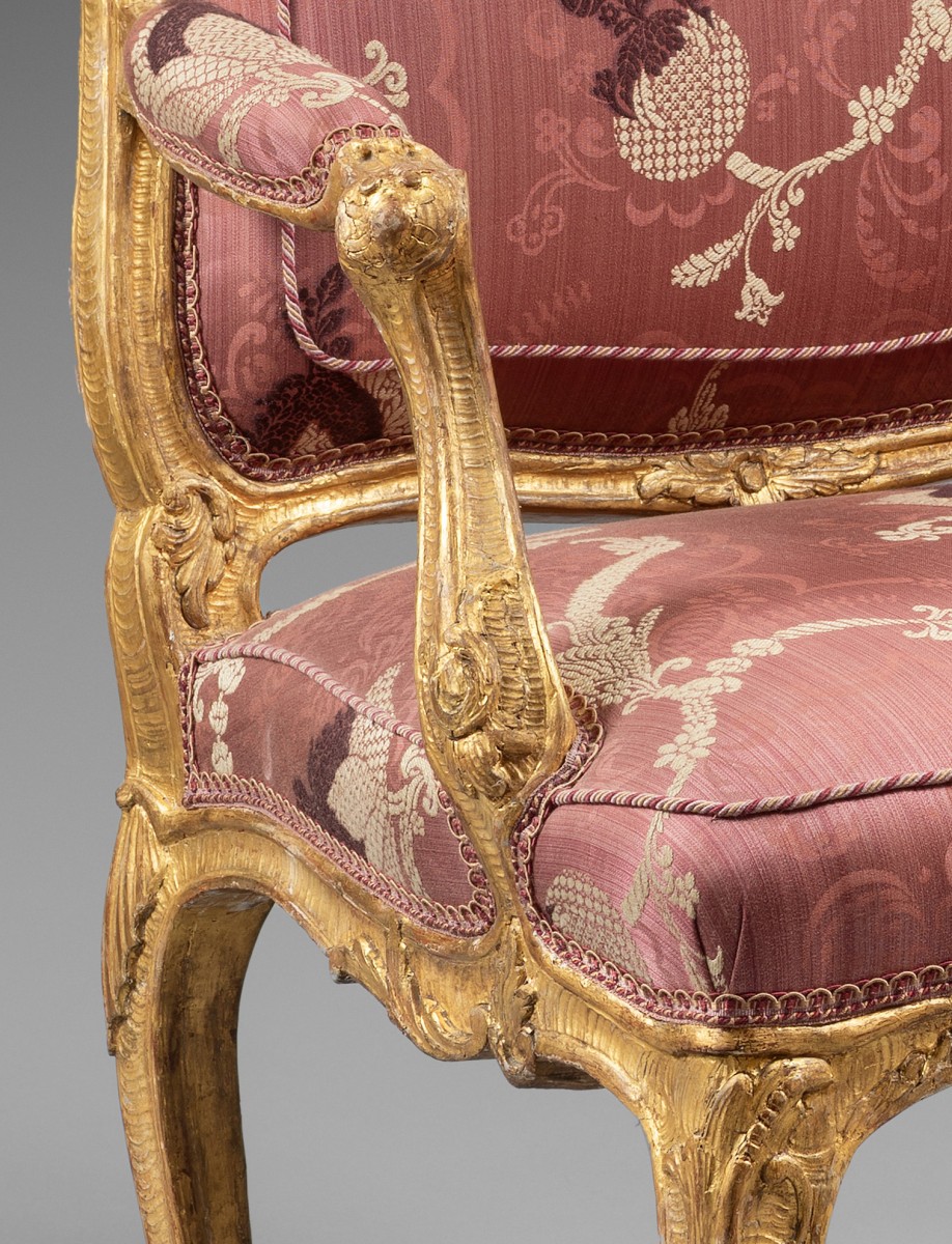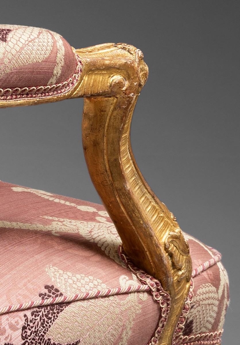 Ces six fauteuils à dossiers plats, dits à la Reine, sont en hêtre finement sculpté et dorés à la feuille. La sculpture abondante est composée de volutes feuillagées, de grenades éclatées, de feuilles d’acanthe, et d’agrafes. La belle cambrure des pieds et des traverses, le dossier bien épaulé, et le répertoire ornemental nous oriente vers un travail de l’ainé des Cresson, dynastie d’ébénistes parmi les meilleurs de la première moitié du 18ème siècle. Les assises larges, parfaitement ...