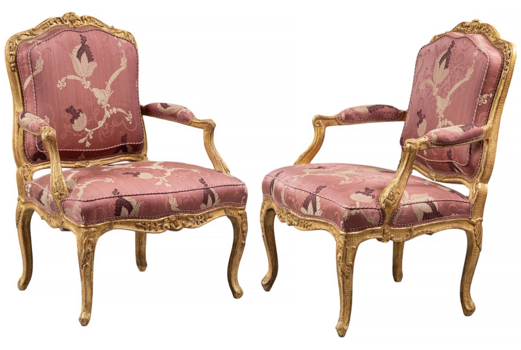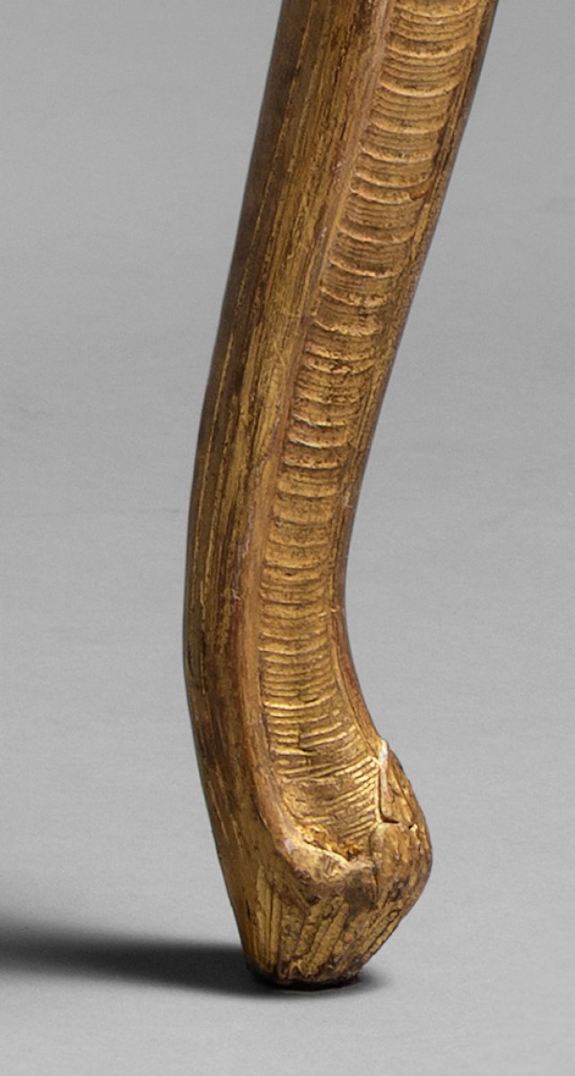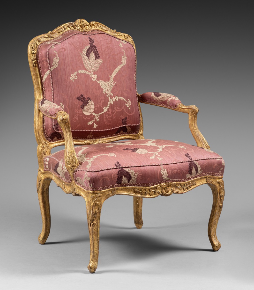 Ces six fauteuils à dossiers plats, dits à la Reine, sont en hêtre finement sculpté et dorés à la feuille. La sculpture abondante est composée de volutes feuillagées, de grenades éclatées, de feuilles d’acanthe, et d’agrafes. La belle cambrure des pieds et des traverses, le dossier bien épaulé, et le répertoire ornemental nous oriente vers un travail de l’ainé des Cresson, dynastie d’ébénistes parmi les meilleurs de la première moitié du 18ème siècle. Les assises larges, parfaitement ...