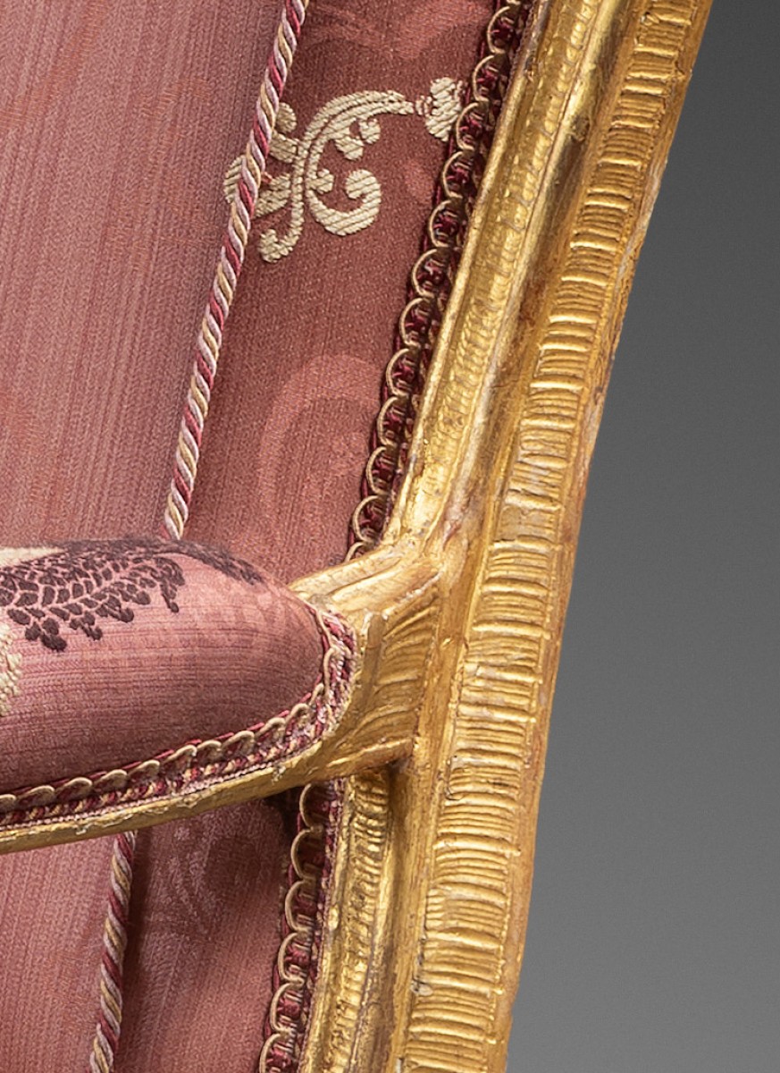 Ces six fauteuils ont conservé leur dorure d’origine et notamment leur exceptionnelle reparure qui constitue un élément inhabituel et distinctif. Cette reparure à décor de vagues, est présente sur tous les montants et toutes les traverses, à l’avant comme à l’arrière des sièges.