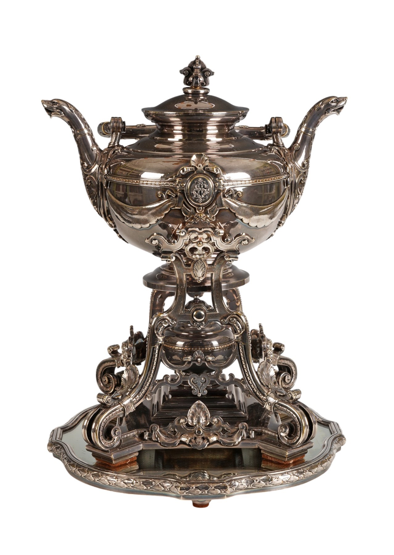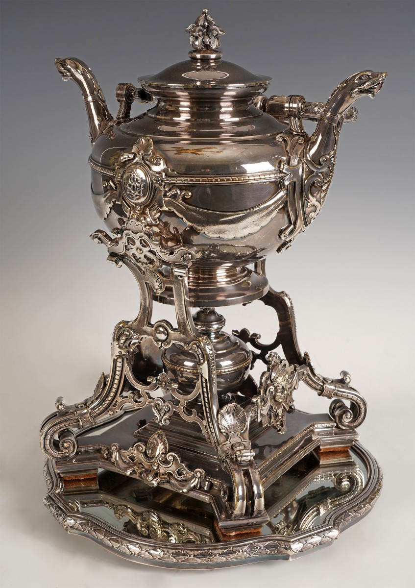 Élégant samovar en bronze argenté, composé en partie supérieure d’une verseuse à anse, sommée d’un couvercle à prise finement ouvragée, flanquée de becs verseurs zoomorphes de chaque côté, participant ainsi à l’équilibre visuel de l’objet. La panse est ornée d’un médaillon chiffré suggérant une commande aristocratique ou bourgeoise entouré dans un cartouche à bords découpés et relié aux becs par un drapé à bords festonnés. Elle est posée sur un support composé de montants courbes en volutes, reliés par des entretoises ornées de motifs d’entrelacs et de mascarons féminins, et finissant par des volutes intégrées dans un plateau à pans découpés, sur lequel est surélevée sur une plateforme à gradins le réservoir de forme circulaire, permettant le maintien de l’eau chaude.