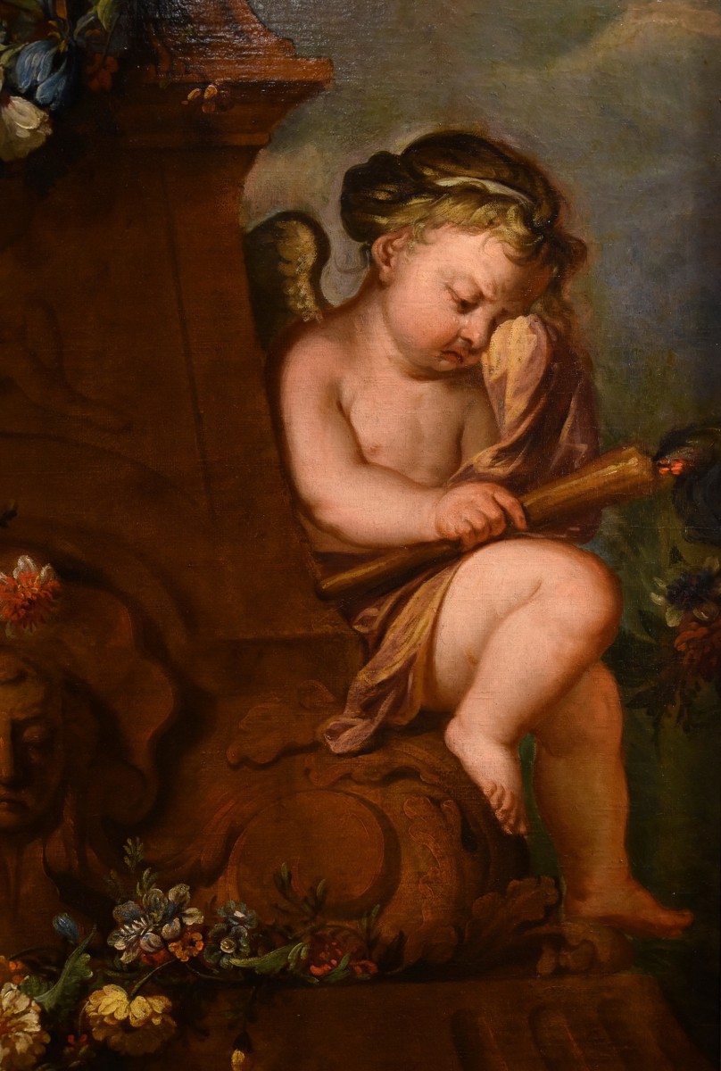 Retrouver le mobilier ou les objets d''art similaires à « Couple de Cupidons avec guirlande de fleurs - École hollandaise du 18e siècle » présenté par Antichità Castelbarco, antiquaire à Riva del Garda dans la catégorie Tableaux XVIIIe siècle Louis XIV, Tableaux et dessins.