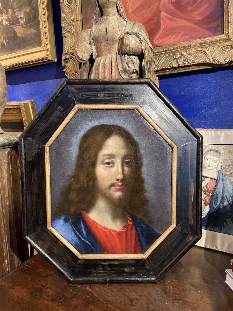 Le format octogonal, la douceur du modelé du visage et l’intensité retenue de l’expression confèrent à l’image un caractère de dévotion intime, destiné à un cadre privé. Le cadre noir à filet intérieur doré souligne avec élégance le goût du XVIIe siècle.