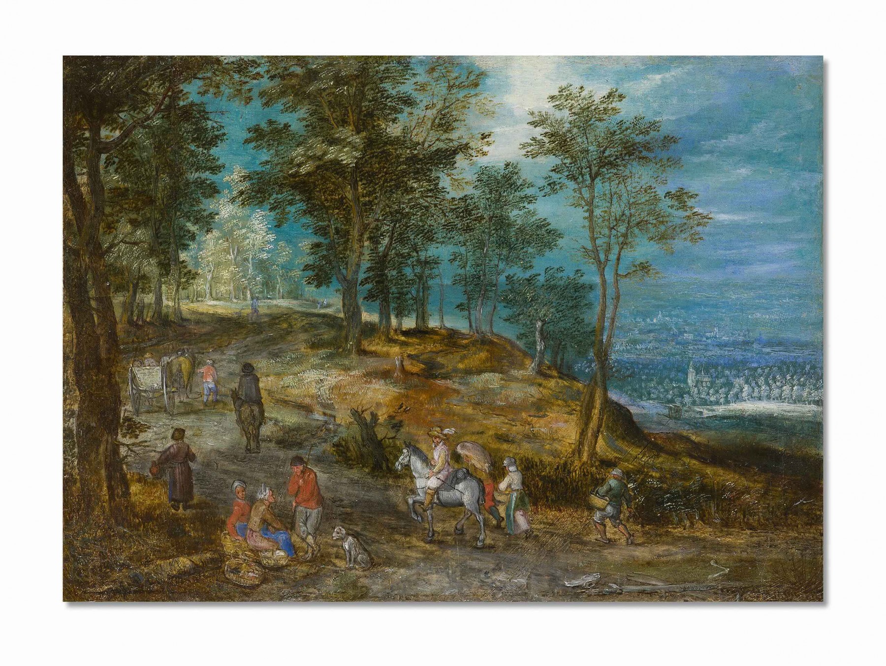Jan BRUEGHEL Le Vieux dit de Velours ECOLE FLAMANDE (1568 - 1625) "paysage à la calèche" Huile sur panneau mesurant: H. 16 X L. 21 cm Expertise du Dr Klaus ERTZ