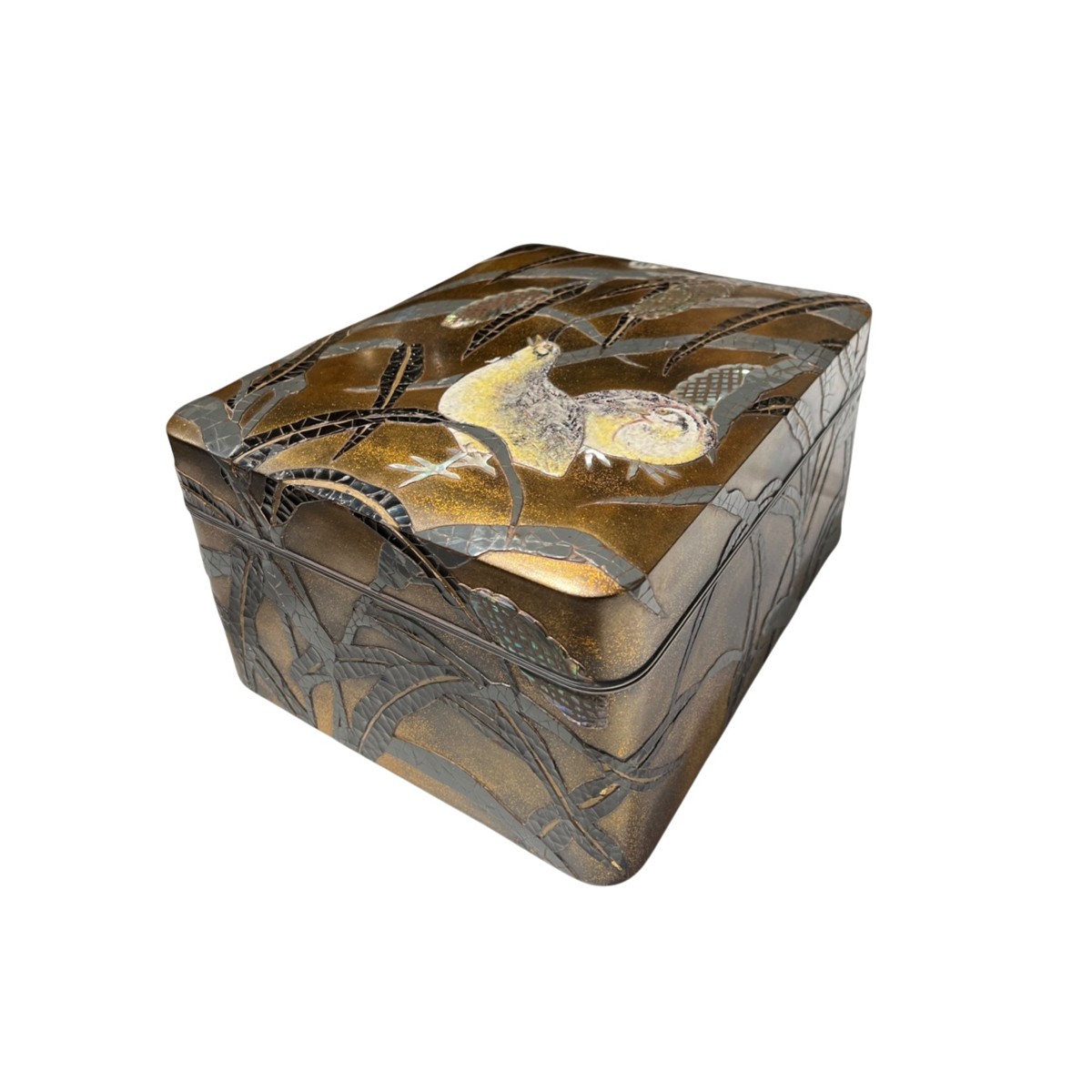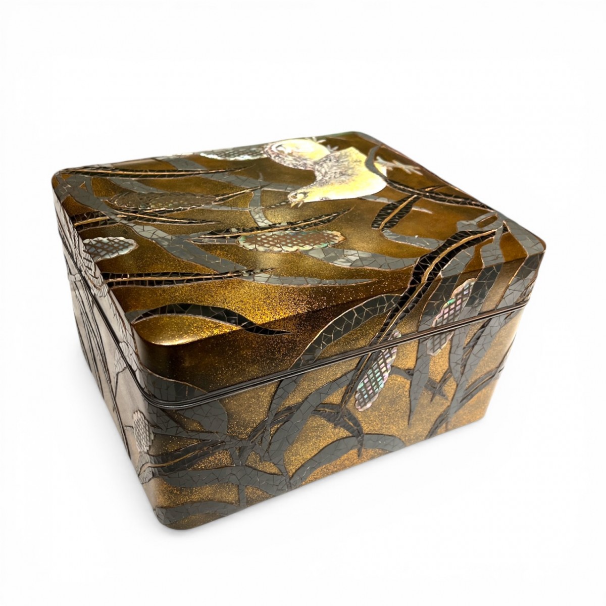 Cette boîte, probablement destinée à ranger des objets pour la cérémonie du thé, associe un travail de maki-e en relief, des incrustations de nacre et, fait beaucoup plus rare, deux cailles traitées en céramique émaillée appliquée. Elle constitue un exemple particulièrement intéressant du renouveau de la laque japonaise au XXe siècle, entre tradition décorative, virtuosité technique et recherche plastique.