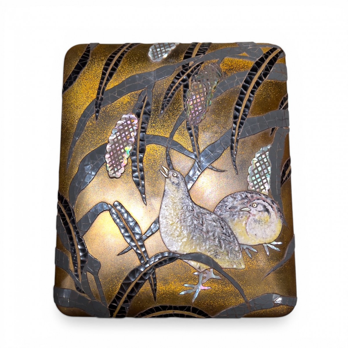 Mais cette œuvre ne se réduit pas à une survivance du goût Rimpa. Elle manifeste aussi le renouveau de la laque japonaise au XXe siècle. Le relief marqué, la présence de nacre découpée et surtout l’intégration exceptionnelle de cailles en céramique émaillée montrent une volonté d’expérimentation tout en se réappropriant des techniques anciennes. Cette hybridation rare entre tradition et invention place la boîte dans un moment où l’artisanat japonais cherche à renouveler son vocabulaire sans rompre avec son héritage.