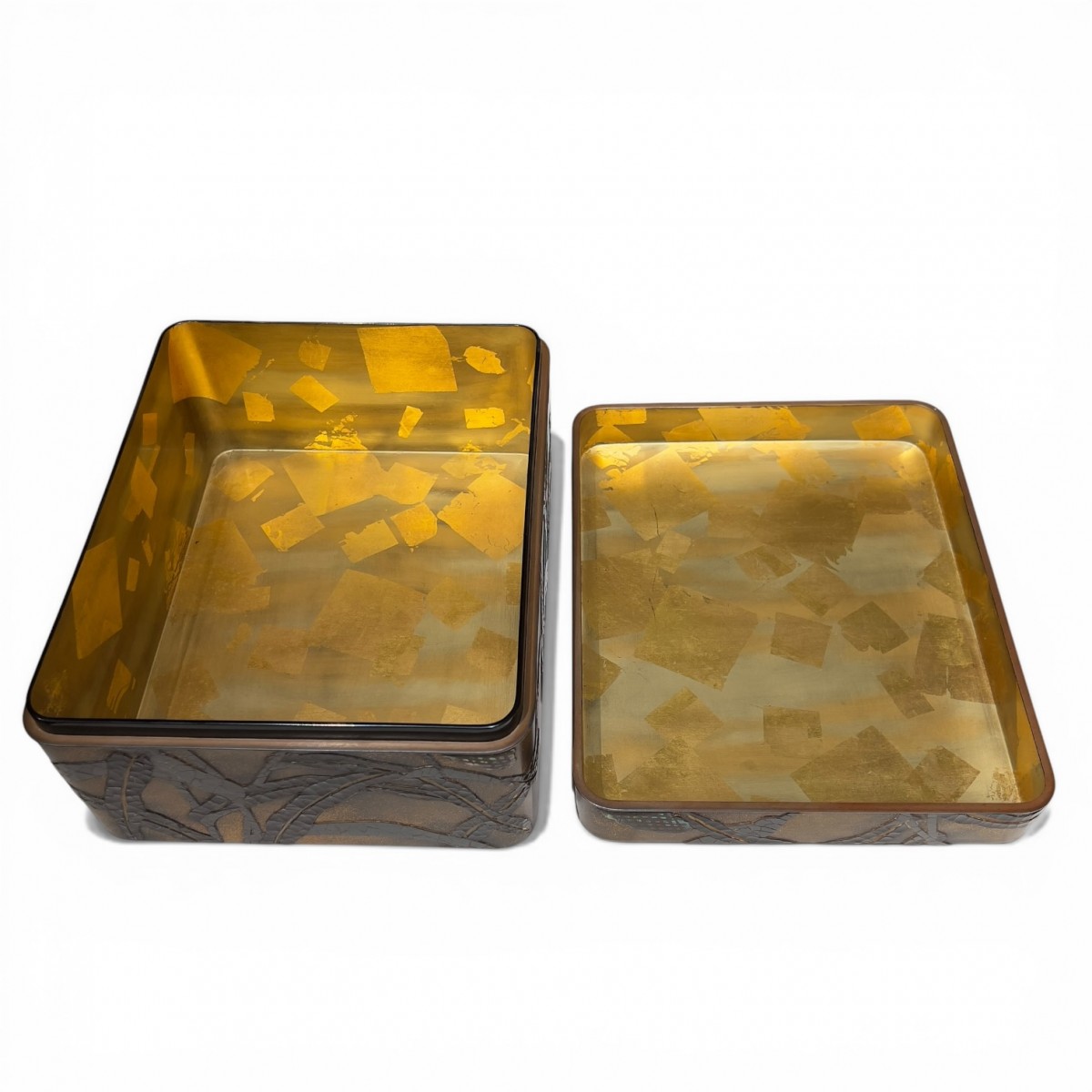 L’intérieur est couvert de larges carrés irréguliers de feuille d’or, produisant un effet fragmenté et précieux, très caractéristique d’un objet conçu comme une pièce de grand décor autant que comme un objet d’usage. L’ensemble est conservé dans son tomobako signé Ch?k? saku.