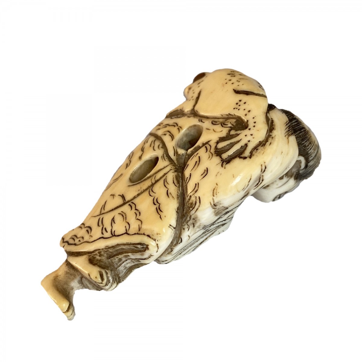 Netsuké en ivoire à belle patine légèrement teintée avec fines gerces naturelles, finement sculpté, repésentant Gamma Sennin avec son crapaud sur sur l’ épaule. Les yeux du crapaud sont incrustés en corne blonde.