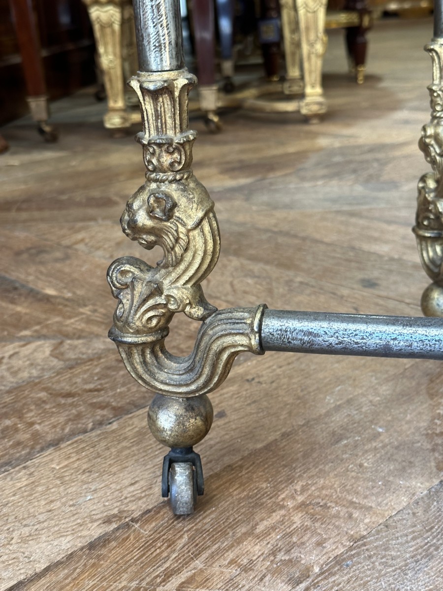 Les pieds décorés en haut de feuilles d'acanthes en dorure et en bas par des mufles de lions dorés également.