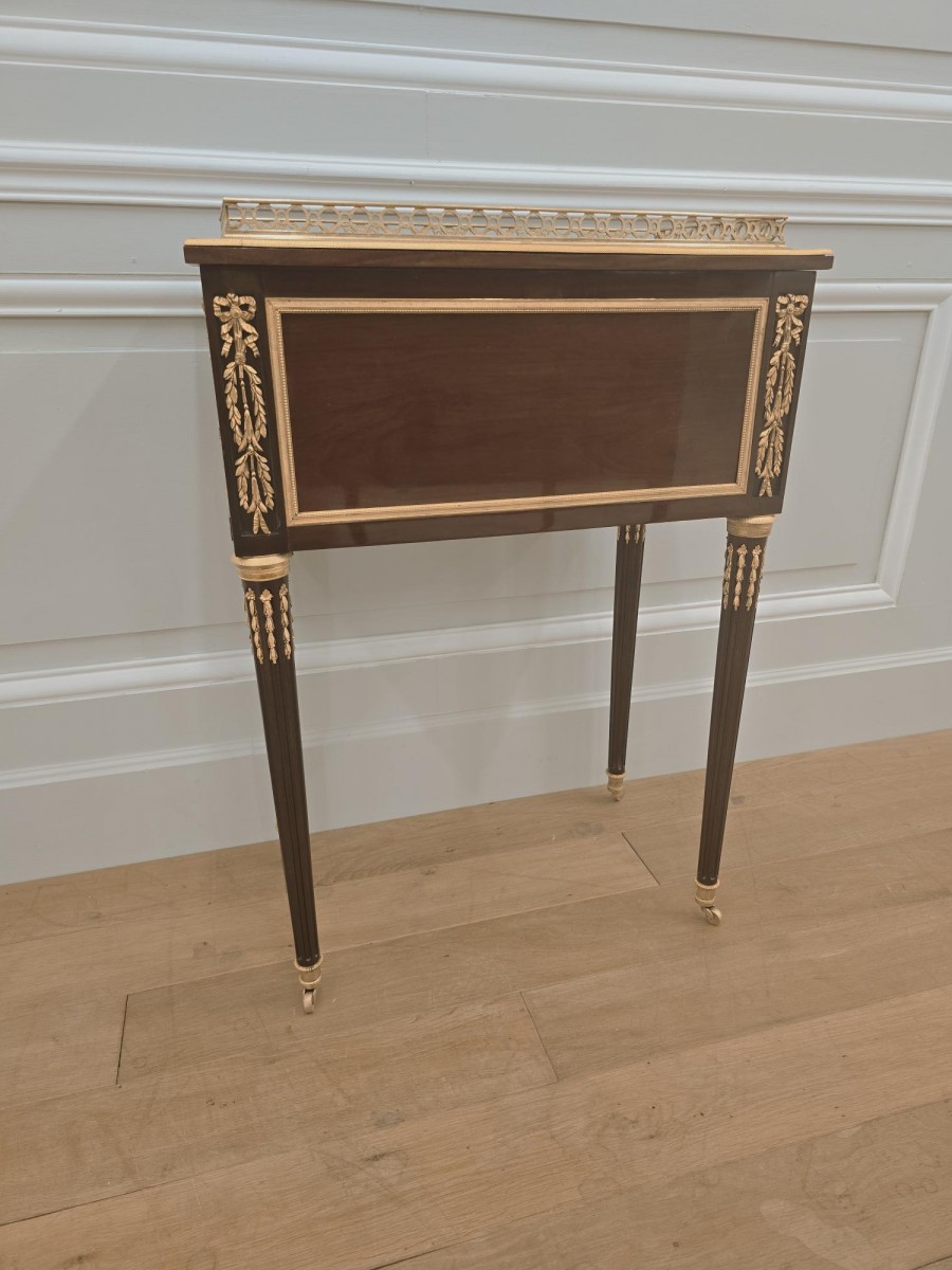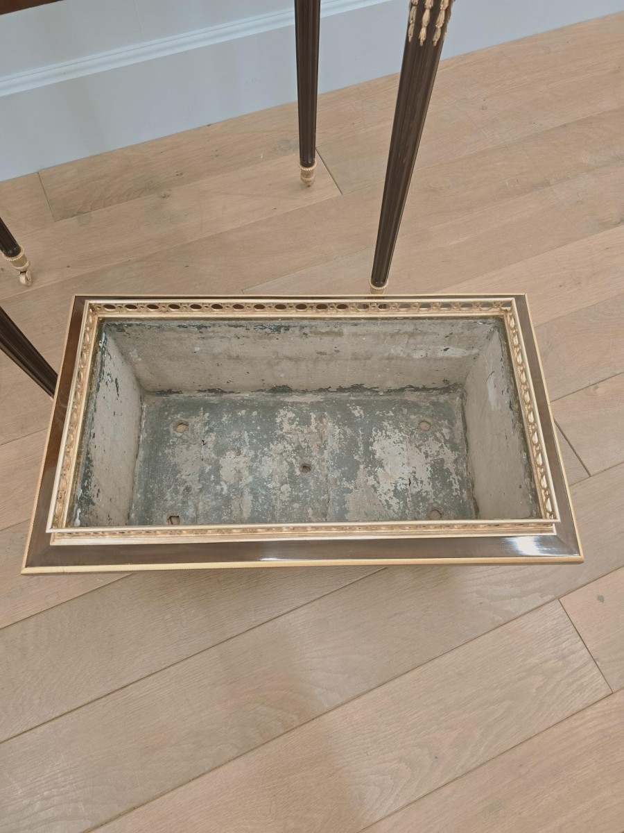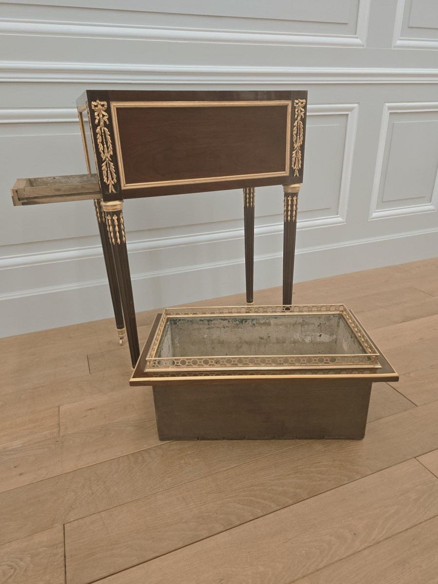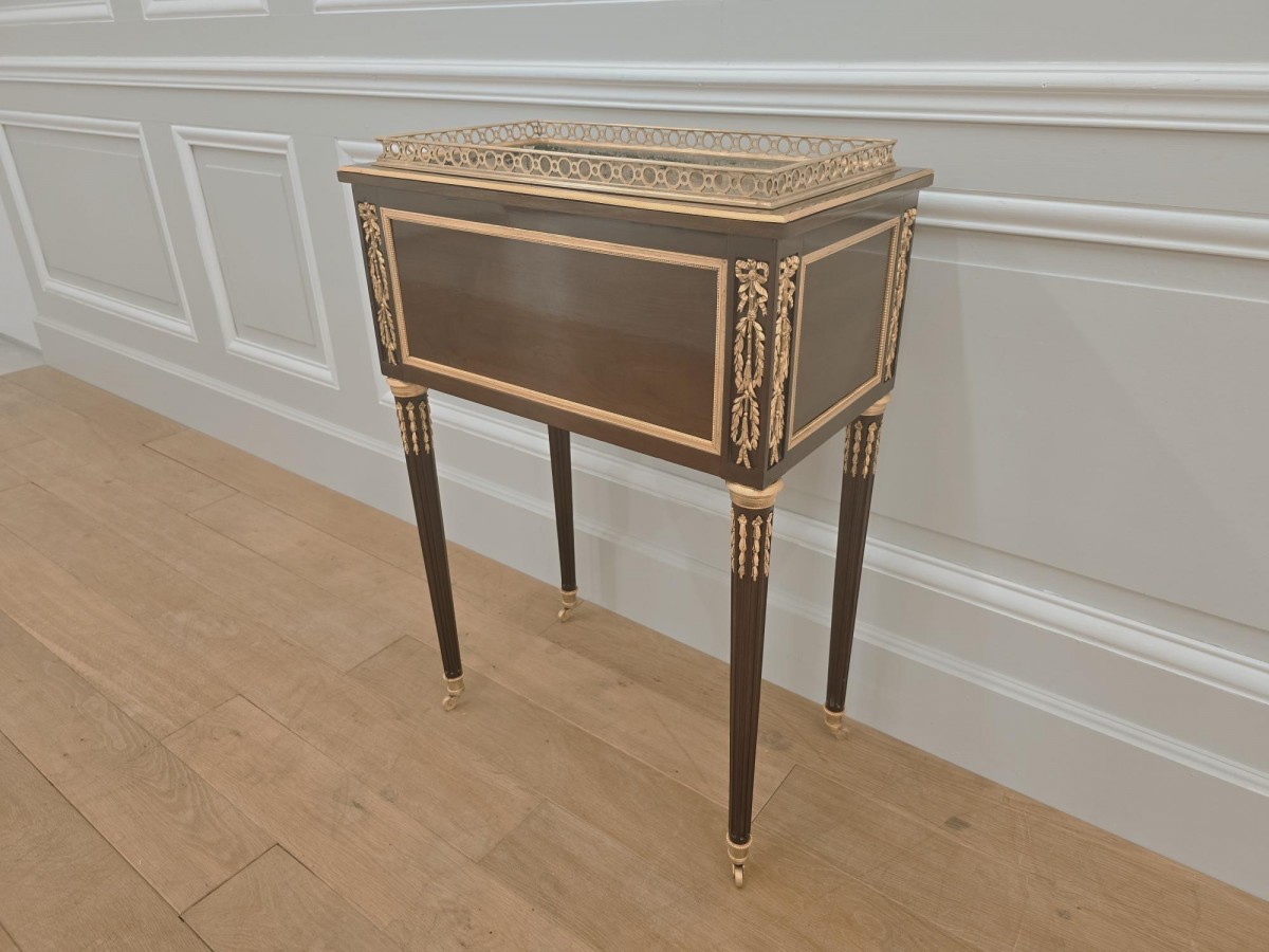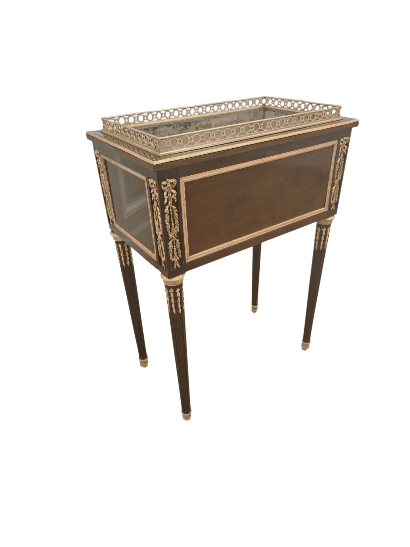 Jardinière d'époque Louis XVI en acajou, elle repose sur ses quatres pieds fuselés et cannelés, un tiroir sur la partie latérale garnis de zinc, permet de recevoir le trop plein d'eau. Tous les bronzes sont ciselés et dorés, meuble de très belle exécution.
