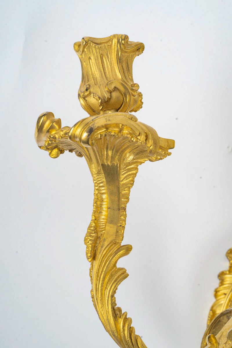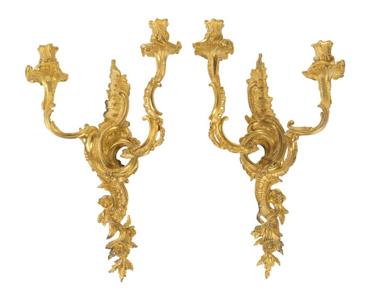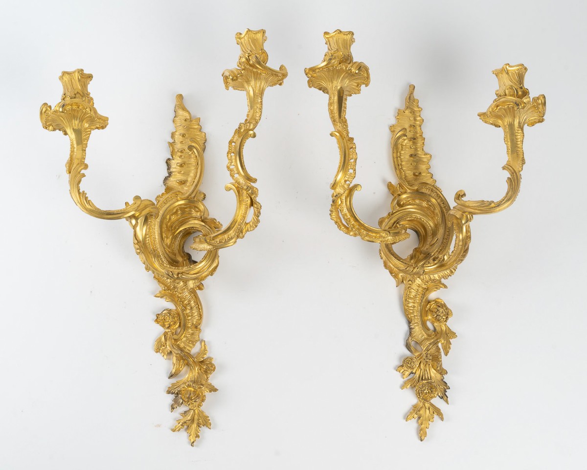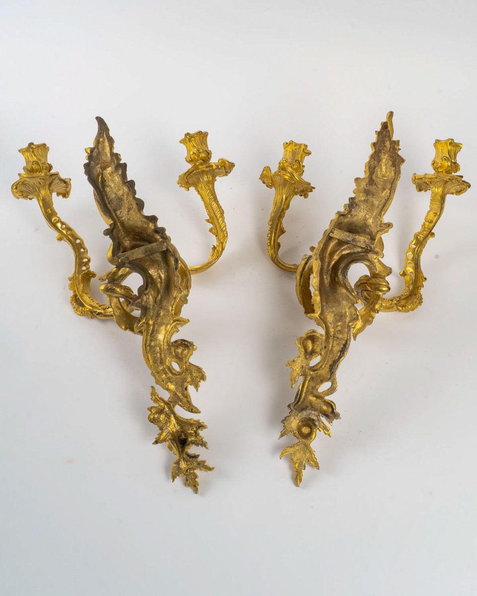 Retrouver le mobilier ou les objets d''art similaires à « Jean-François Deniere (1774-1866) Paire d’appliques Louis XV en bronze ciselé et doré » présenté par MLD Antiquités, antiquaire à Saint Ouen dans la catégorie Appliques Louis XV, Luminaires.