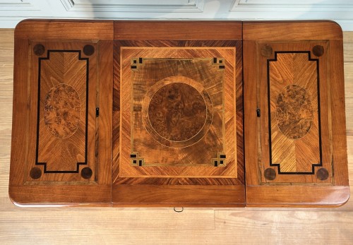 ... la capacité plane de la coiffeuse une fois ceux-ci déployés. Toujours dans ce même souci, les deux cuves intérieures sont obturées chacune par un plateau en noyer s’articulant d’avant en arrière par des charnières. La ceinture chantournée est plane avant de s’incurver légèrement sur quelques centimètre, infime détail qui donne à cette table, élégance et fluidité . En façade, elle dispose d’une tirette à écrire, celle-ci gainée d’un maroquin ancien, au-dessus du tiroir central et comprend deux petits tiroirs latéraux, dont l’un est simulé. L’ensemble repose sur un piétement à quatre pieds légèrement cambrés et chanfreinés de haut en bas, ponctués de petits sabots rocailles feuillagés posés sur ses roulettes de bois. L’estampille de Jean-François Hache : Hache fils à Grenoble est frappée sur le chant du tiroir central de part et autre de la serrure. Notre table dispose de toutes ses serrures et de sa clef en parfait état de fonctionnement.