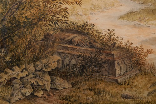 Or, bien qu’elle s’inscrive dans la suite du courant « troubadour » né au tout début du siècle, c’est déjà un souffle romantique qui anime la grande aquarelle que nous présentons. Le sujet est tiré d’un épisode de la vie de William Wallace (1272-1305), héros de l’indépendance écossaise qui mena son peuple contre la domination des Anglais sous le règne d’Edouard Ier et connut une fin cruelle. Mais dans notre image, Wallace a réussi à s’échapper grâce à un souterrain, et l’artiste le représente à genoux, les bras levés vers le Ciel, comme pour lui rendre grâces de son salut. Le personnage, toutefois, est minuscule, de même que le petit moine qui disparaît sous un porche. (Pour réaliser ces figures, Champin a d’ailleurs eu recours à un spécialiste, le prix de Rome Jean-Baptiste Thomas ; ce genre de collaboration était fréquent entre peintres.) C’est que le véritable sujet du tableau est cette impressionnante abbaye gothique, dessinée avec une précision d’architecte, dont les tours sont vues en contre-plongée. Curieusement, l'édifice se trouve en partie ruiné, alors qu’on pourrait le supposer récemment construit… Laissé à l’abandon, envahi par la végétation, - avec ce grand buisson de roses trémières et ces herbes folles à l’assaut d’un gisant -, le cimetière adjacent est éclairé par l’étrange lumière orangée qui précède un orage. Des oiseaux affolés tentent de fuir la menaçante masse noire des nuages. A peine esquissés, des sapins paraissent à travers l’ogive d’un portail, détail qui évoque des visions contemporaines de Gaspar David Friedrich. Le goût naissant des artistes pour les monuments médiévaux, châteaux-forts, églises et cloîtres jusqu’alors dédaignés, prend ici une dimension fantastique qui transcende l’intérêt archéologique. La date précoce de l’œuvre (1820), la taille inaccoutumée de la feuille, l’importance que lui a accordée l’auteur en l’exposant deux ans plus tard au Salon, le choix d’une architecture gothique et d'un cimetière comme théâtre de l’action, justifiaient que nous retenions cette œuvre au milieu d’autres illustrations d’un romantisme noir.