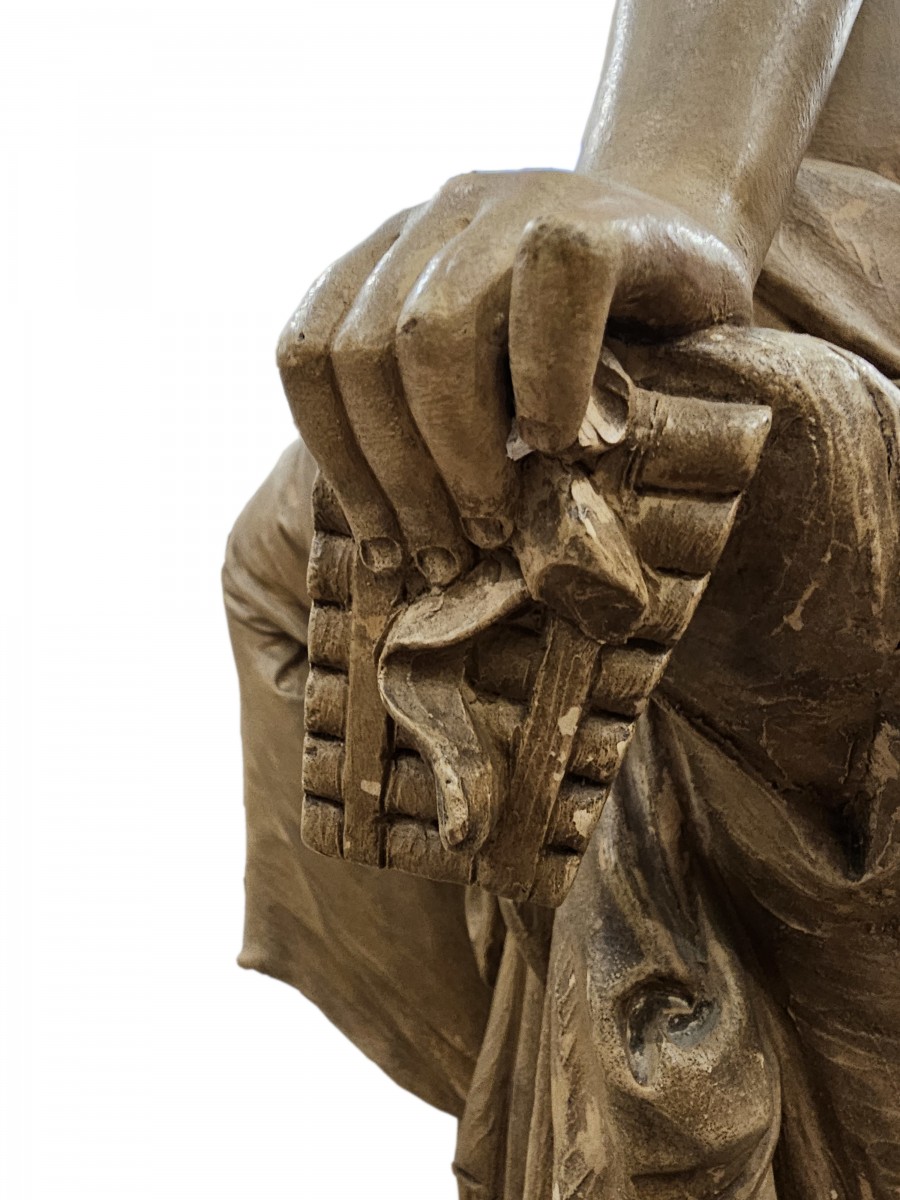 Notre sculpture en terre cuite représente Syrinx, personnage connu dans la mythologie grecque ainsi que dans les Métamorphoses d'Ovide. La jeune femme est ici représentée avant sa transformation en roseaux, assise sur une souche près des berges du Ladon. Elle demande aux nymphes du fleuve de la métamorphoser dans le but d'éconduire les avances du dieu Pan. Elle tient dans sa main gauche la fameuse flûte de Pan, illustrant l'instrument qu'il a fabriqué pour communiquer avec elle et la reconquérir.