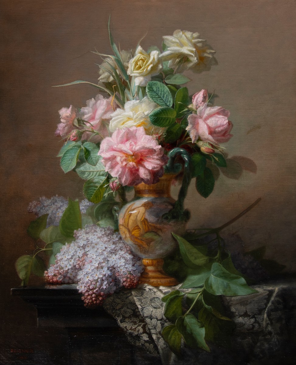 Le présent tableau illustre parfaitement le raffinement et la minutie de son art. Dans un élégant vase décoré, Reignier a composé un bouquet généreux de roses blanches et roses, disposées avec naturel et harmonie. Les fleurs épanouies se mêlent aux boutons encore fermés, traduisant le passage du temps et la diversité des formes. À la base, de superbes grappes de lilas mauves débordent sur la table, apportant un contrepoint coloré à la blancheur des roses.