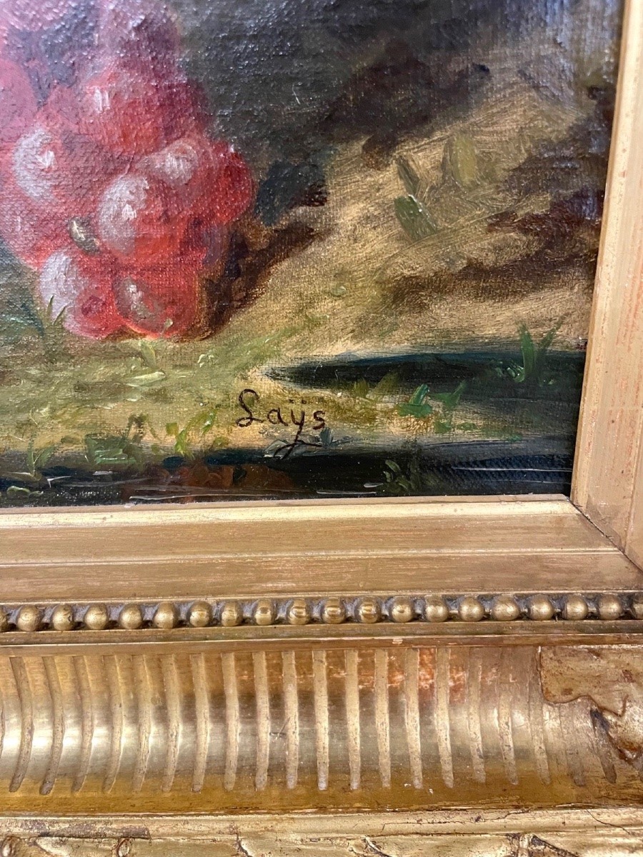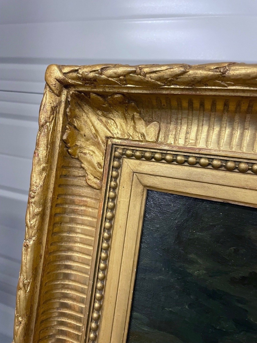 Signée, cadre à canaux doré à la feuille.
