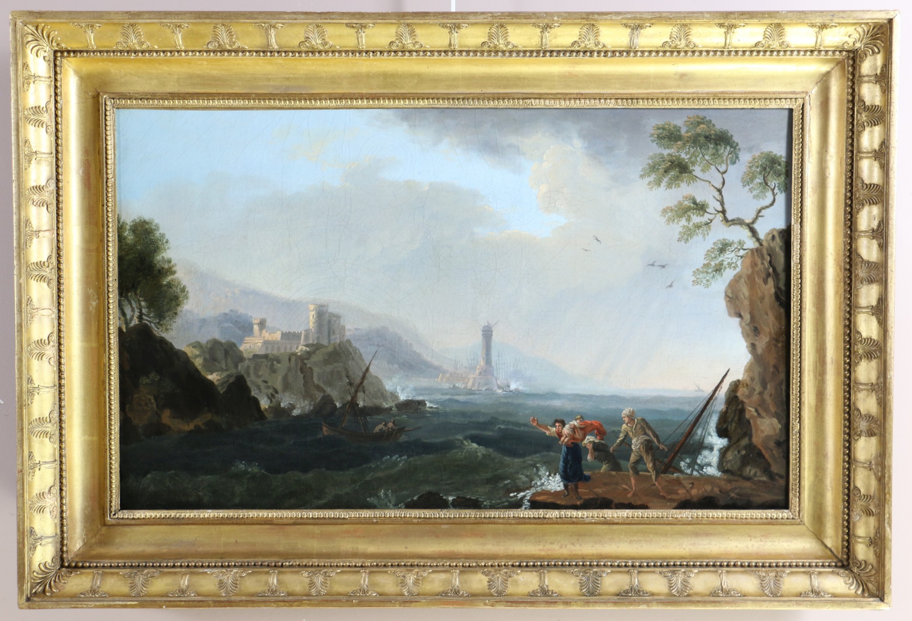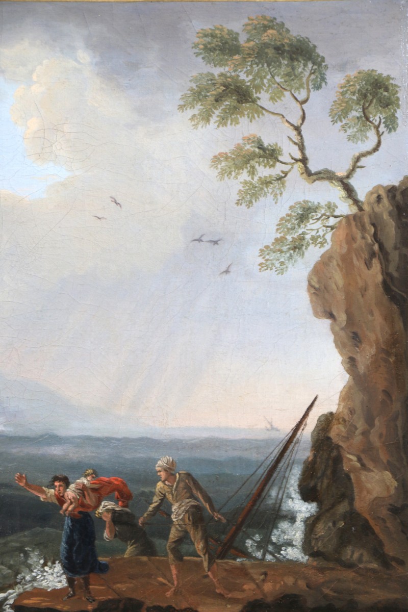 A Rocky Coast by the Mouth of the Tagus, with Survivors (1786) Christie’s London, vendue plus de 70000€ dans laquelle on peut observer une grande similitude des personnages et de leurs expressions avec notre tableau.