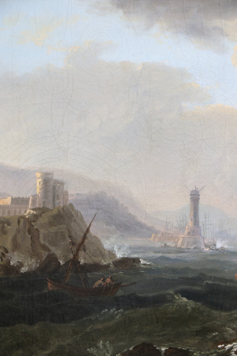 À l’arrière-plan, un phare monumental, érigé sur une jetée, se détache dans une atmosphère brumeuse, tandis que des architectures portuaires et des navires esquissés émergent dans la pénombre. Les rochers abrupts et un arbre aux branches souples et feuillages légers encadrent la composition, créant un contraste entre la solidité de la terre et l’instabilité de la mer.