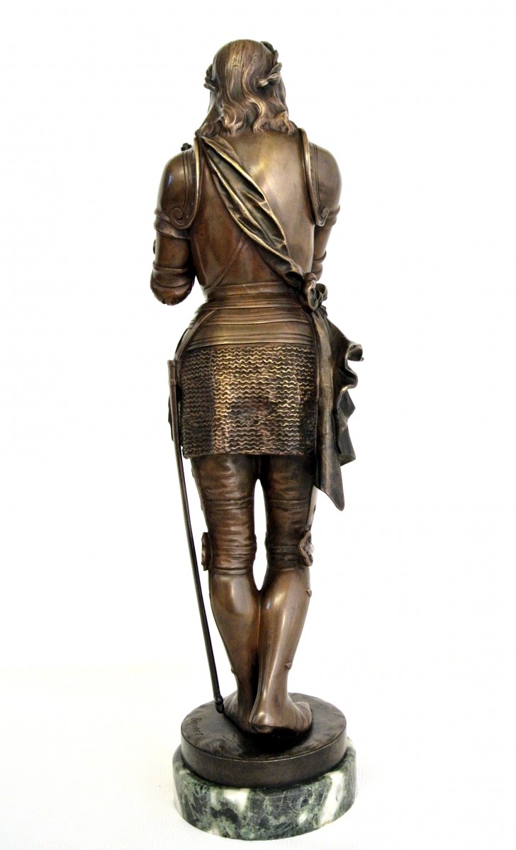 Statue en bronze d’époque début XXe, d’après une sculpture d’Eutrope Bouret. Jeanne d’Arc est représentée en action de grâce (prière de remerciement) coiffée d’une couronne de laurier en tenue de combattante et tenant son épée dirigée pointe en bas (la poignée symbolisant la Croix). Bel état de présentation, patine médaille d’origine avec une légère usure d’usage, base en marbre vert antique. Cette version de Jeanne d’Arc exprime un certain réalisme dans sa posture et l’expression du visage ainsi que dans les détails de sa tenue. La hauteur indiquée tient compte du socle en marbre.