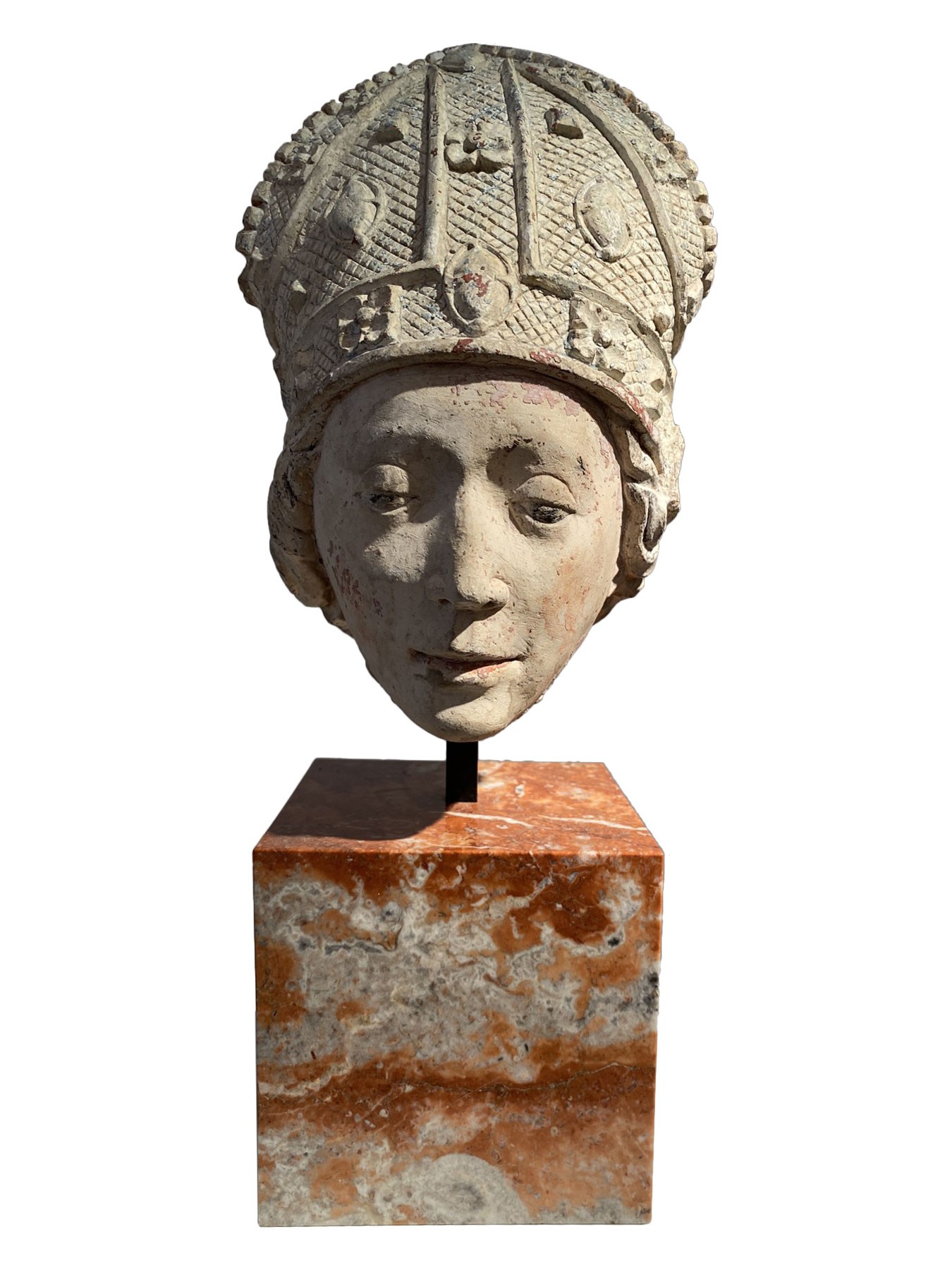 Tête d’un jeune évêque – pierre calcaire avec restes de polychromie